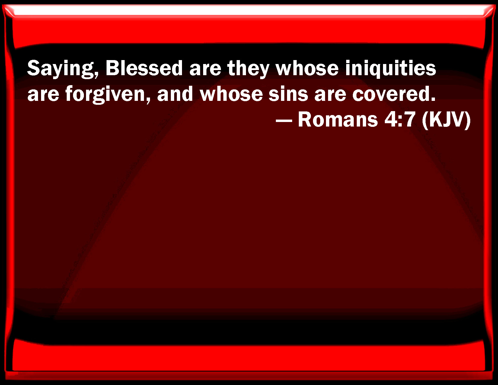 Bible Verse Slide Romans 4:7 Saying, Blessed are they whose iniquities are forgiven, and whose sins are covered. KJV: Saying, Blessed are they whose iniquities are forgiven, and whose sins are covered. DRB: Blessed are they whose iniquities are forgiven, and whose sins are covered. DBT: Blessed they whose lawlessnesses have been forgiven, and whose sins have been covered: ERV: saying, Blessed are they whose iniquities are forgiven, And whose sins are covered. WBT: Saying, Blessed are they whose iniquities are forgiven, and whose sins are covered. WEB: "Blessed are they whose iniquities are forgiven, whose sins are covered. YLT: 'Happy they whose lawless acts were forgiven, and whose sins were covered;Links Romans 4:7 NIV • Romans 4:7 NLT • Romans 4:7 ESV • Romans 4:7 NASB • Romans 4:7 KJV • Romans 4:7 Interlinear • Romans 4:7 Commentaries • Romans 4:7 Parallel Texts • Romans 4:7 Bible Apps • Romans 4:7 Parallel • Bible Hub |