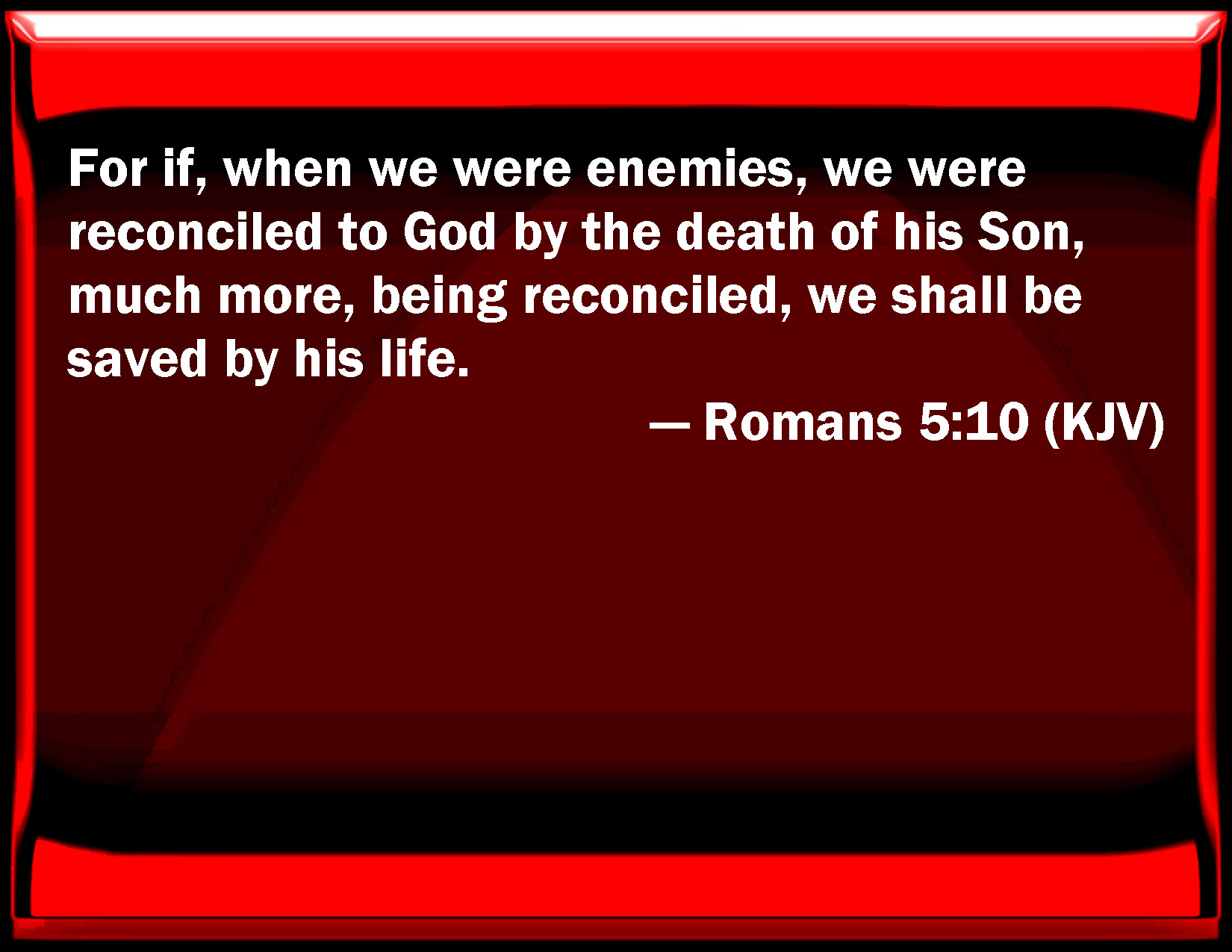 Bible Verse Slide Romans 5:10 For if, when we were enemies, we were reconciled to God by the death of his Son, much more, being reconciled, we shall be saved by his life. KJV: For if, when we were enemies, we were reconciled to God by the death of his Son, much more, being reconciled, we shall be saved by his life. DRB: For if, when we were enemies, we were reconciled to God by the death of his Son; much more, being reconciled, shall we be saved by his life. DBT: For if, being enemies, we have been reconciled to God through the death of his Son, much rather, having been reconciled, we shall be saved in the power of his life. ERV: For if, while we were enemies, we were reconciled to God through the death of his Son, much more, being reconciled, shall we be saved by his life; WBT: For if when we were enemies, we were reconciled to God by the death of his Son; much more, being reconciled, we shall be saved by his life. WEB: For if, while we were enemies, we were reconciled to God through the death of his Son, much more, being reconciled, we will be saved by his life. YLT: for if, being enemies, we have been reconciled to God through the death of His Son, much more, having been reconciled, we shall be saved in his life.Links Romans 5:10 NIV • Romans 5:10 NLT • Romans 5:10 ESV • Romans 5:10 NASB • Romans 5:10 KJV • Romans 5:10 Interlinear • Romans 5:10 Commentaries • Romans 5:10 Parallel Texts • Romans 5:10 Bible Apps • Romans 5:10 Parallel • Bible Hub |