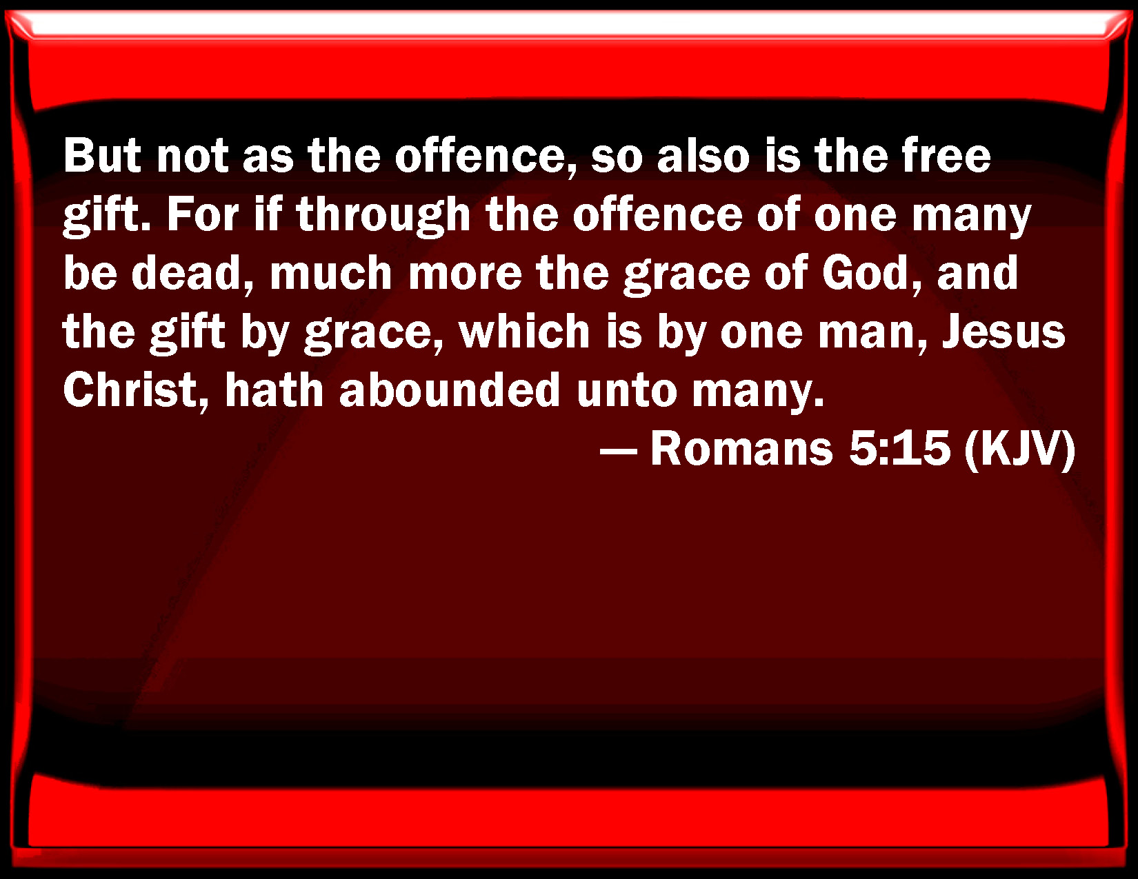 Bible Verse Slide Romans 5:15 But not as the offense, so also is the free gift. For if through the offense of one many be dead, much more the grace of God, and the gift by grace, which is by one man, Jesus Christ, has abounded to many. KJV: But not as the offence, so also is the free gift. For if through the offence of one many be dead, much more the grace of God, and the gift by grace, which is by one man, Jesus Christ, hath abounded unto many. DRB: But not as the offence, so also the gift. For if by the offence of one, many died; much more the grace of God, and the gift, by the grace of one man, Jesus Christ, hath abounded unto many. DBT: But shall not the act of favour be as the offence? For if by the offence of one the many have died, much rather has the grace of God, and the free gift in grace, which is by the one man Jesus Christ, abounded unto the many. ERV: But not as the trespass, so also is the free gift. For if by the trespass of the one the many died, much more did the grace of God, and the gift by the grace of the one man, Jesus Christ, abound unto the many. WBT: But not as the offense, so also is the free gift. For if through the offense of one many are dead, much more the grace of God, and the gift by grace, which is by one man, Jesus Christ, hath abounded to many. WEB: But the free gift isn't like the trespass. For if by the trespass of the one the many died, much more did the grace of God, and the gift by the grace of the one man, Jesus Christ, abound to the many. YLT: But, not as the offence so also is the free gift; for if by the offence of the one the many did die, much more did the grace of God, and the free gift in grace of the one man Jesus Christ, abound to the many;Links Romans 5:15 NIV • Romans 5:15 NLT • Romans 5:15 ESV • Romans 5:15 NASB • Romans 5:15 KJV • Romans 5:15 Interlinear • Romans 5:15 Commentaries • Romans 5:15 Parallel Texts • Romans 5:15 Bible Apps • Romans 5:15 Parallel • Bible Hub |