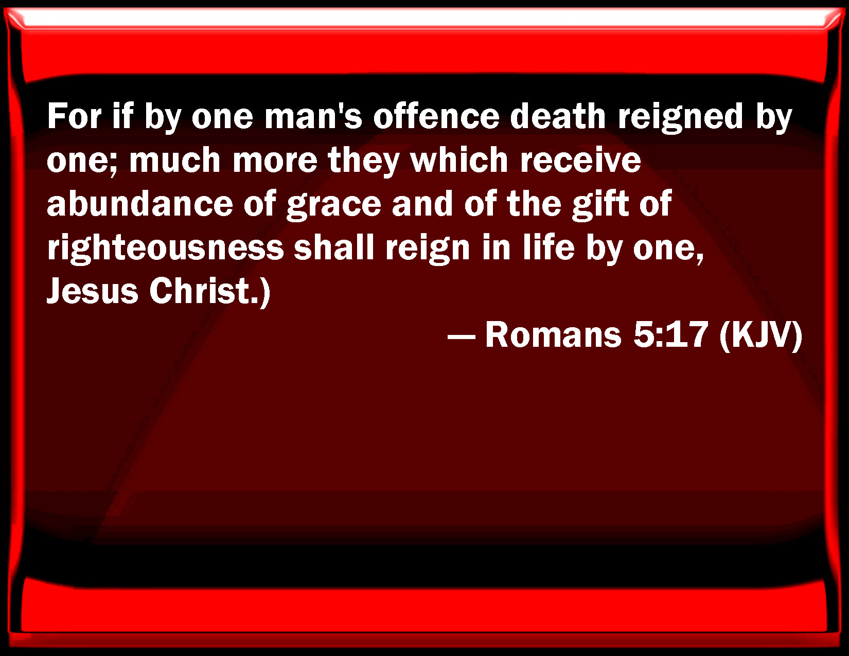 Bible Verse Slide Romans 5:17 For if by one man's offense death reigned by one; much more they which receive abundance of grace and of the gift of righteousness shall reign in life by one, Jesus Christ.) KJV: For if by one man's offence death reigned by one; much more they which receive abundance of grace and of the gift of righteousness shall reign in life by one, Jesus Christ.) DRB: For if by one man's offence death reigned through one; much more they who receive abundance of grace, and of the gift, and of justice, shall reign in life through one, Jesus Christ. DBT: For if by the offence of the one death reigned by the one, much rather shall those who receive the abundance of grace, and of the free gift of righteousness, reign in life by the one Jesus Christ:) ERV: For if, by the trespass of the one, death reigned through the one; much more shall they that receive the abundance of grace and of the gift of righteousness reign in life through the one, even Jesus Christ. WBT: For if by one man's offense death reigned by one; much more they who receive abundance of grace, and of the gift of righteousness, shall reign in life by one, Jesus Christ. WEB: For if by the trespass of the one, death reigned through the one; so much more will those who receive the abundance of grace and of the gift of righteousness reign in life through the one, Jesus Christ. YLT: for if by the offence of the one the death did reign through the one, much more those, who the abundance of the grace and of the free gift of the righteousness are receiving, in life shall reign through the one — Jesus Christ.Links Romans 5:17 NIV • Romans 5:17 NLT • Romans 5:17 ESV • Romans 5:17 NASB • Romans 5:17 KJV • Romans 5:17 Interlinear • Romans 5:17 Commentaries • Romans 5:17 Parallel Texts • Romans 5:17 Bible Apps • Romans 5:17 Parallel • Bible Hub |
