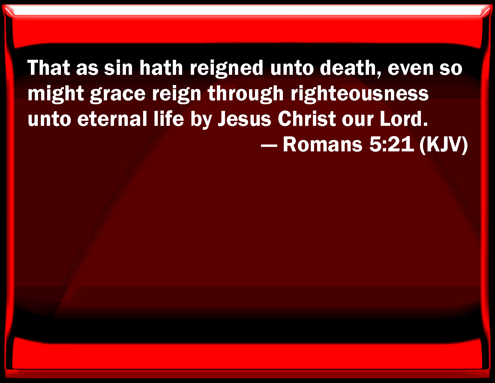 Bible Verse Slide Romans 5:21 That as sin has reigned to death, even so might grace reign through righteousness to eternal life by Jesus Christ our Lord. KJV: That as sin hath reigned unto death, even so might grace reign through righteousness unto eternal life by Jesus Christ our Lord. DRB: That as sin hath reigned to death; so also grace might reign by justice unto life everlasting, through Jesus Christ our Lord. DBT: in order that, even as sin has reigned in the power of death, so also grace might reign through righteousness to eternal life through Jesus Christ our Lord. ERV: that, as sin reigned in death, even so might grace reign through righteousness unto eternal life through Jesus Christ our Lord. WBT: That as sin hath reigned to death, even so might grace reign through righteousness to eternal life, by Jesus Christ our Lord. WEB: that as sin reigned in death, even so grace might reign through righteousness to eternal life through Jesus Christ our Lord. YLT: that even as the sin did reign in the death, so also the grace may reign, through righteousness, to life age-during, through Jesus Christ our Lord.Links Romans 5:21 NIV • Romans 5:21 NLT • Romans 5:21 ESV • Romans 5:21 NASB • Romans 5:21 KJV • Romans 5:21 Interlinear • Romans 5:21 Commentaries • Romans 5:21 Parallel Texts • Romans 5:21 Bible Apps • Romans 5:21 Parallel • Bible Hub |