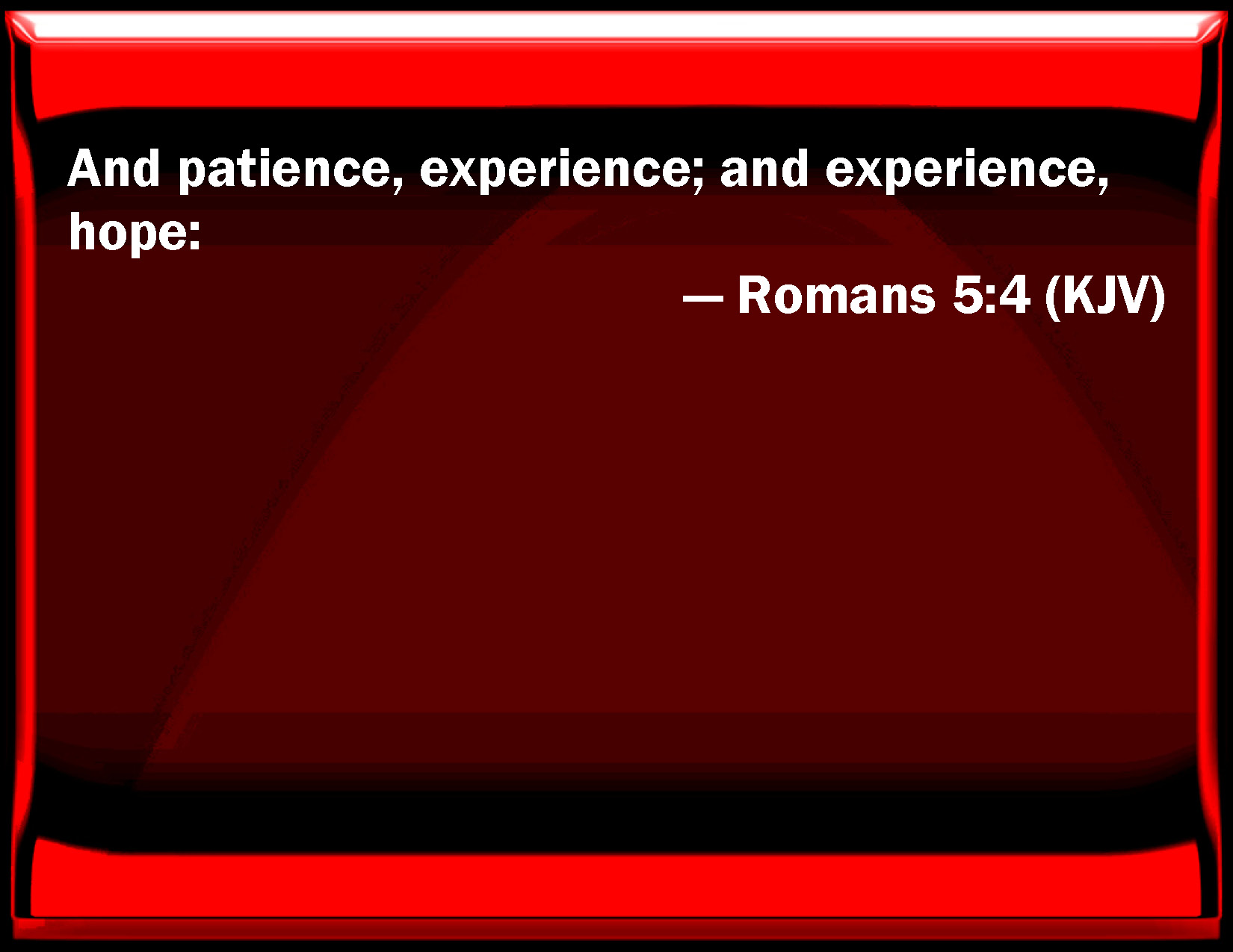 Bible Verse Slide Romans 5:4 And patience, experience; and experience, hope: KJV: And patience, experience; and experience, hope: DRB: And patience trial; and trial hope; DBT: and endurance, experience; and experience, hope; ERV: and patience, probation; and probation, hope: WBT: And patience, experience; and experience, hope: WEB: and perseverance, proven character; and proven character, hope: YLT: and the endurance, experience; and the experience, hope;Links Romans 5:4 NIV • Romans 5:4 NLT • Romans 5:4 ESV • Romans 5:4 NASB • Romans 5:4 KJV • Romans 5:4 Interlinear • Romans 5:4 Commentaries • Romans 5:4 Parallel Texts • Romans 5:4 Bible Apps • Romans 5:4 Parallel • Bible Hub |