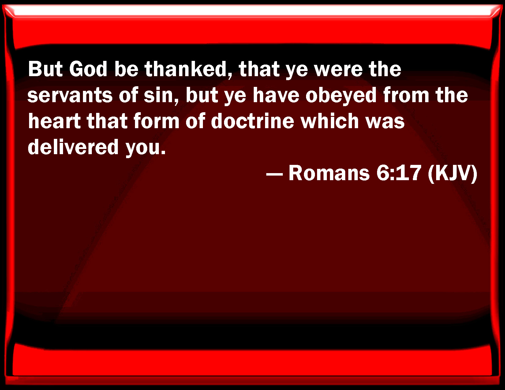 Bible Verse Slide Romans 6:17 But God be thanked, that you were the servants of sin, but you have obeyed from the heart that form of doctrine which was delivered you. KJV: But God be thanked, that ye were the servants of sin, but ye have obeyed from the heart that form of doctrine which was delivered you. DRB: But thanks be to God, that you were the servants of sin, but have obeyed from the heart, unto that form of doctrine, into which you have been delivered. DBT: But thanks be to God, that ye were bondmen of sin, but have obeyed from the heart the form of teaching into which ye were instructed. ERV: But thanks be to God, that, whereas ye were servants of sin, ye became obedient from the heart to that form of teaching whereunto ye were delivered; WBT: But God be thanked, that ye were the servants of sin; but ye have obeyed from the heart that form of doctrine which was delivered you. WEB: But thanks be to God, that, whereas you were bondservants of sin, you became obedient from the heart to that form of teaching whereunto you were delivered. YLT: and thanks to God, that ye were servants of the sin, and — were obedient from the heart to the form of teaching to which ye were delivered up;Links Romans 6:17 NIV • Romans 6:17 NLT • Romans 6:17 ESV • Romans 6:17 NASB • Romans 6:17 KJV • Romans 6:17 Interlinear • Romans 6:17 Commentaries • Romans 6:17 Parallel Texts • Romans 6:17 Bible Apps • Romans 6:17 Parallel • Bible Hub |