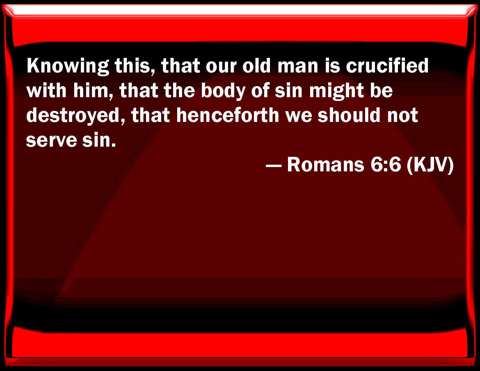 Bible Verse Slide Romans 6:6 Knowing this, that our old man is crucified with him, that the body of sin might be destroyed, that from now on we should not serve sin. KJV: Knowing this, that our old man is crucified with him, that the body of sin might be destroyed, that henceforth we should not serve sin. DRB: Knowing this, that our old man is crucified with him, that the body of sin may be destroyed, to the end that we may serve sin no longer. DBT: knowing this, that our old man has been crucified with him, that the body of sin might be annulled, that we should no longer serve sin. ERV: knowing this, that our old man was crucified with him, that the body of sin might be done away, that so we should no longer be in bondage to sin; WBT: Knowing this, that our old man is crucified with him, that the body of sin may be destroyed, that henceforth we should not serve sin. WEB: knowing this, that our old man was crucified with him, that the body of sin might be done away with, so that we would no longer be in bondage to sin. YLT: this knowing, that our old man was crucified with him, that the body of the sin may be made useless, for our no longer serving the sin;Links Romans 6:6 NIV • Romans 6:6 NLT • Romans 6:6 ESV • Romans 6:6 NASB • Romans 6:6 KJV • Romans 6:6 Interlinear • Romans 6:6 Commentaries • Romans 6:6 Parallel Texts • Romans 6:6 Bible Apps • Romans 6:6 Parallel • Bible Hub |