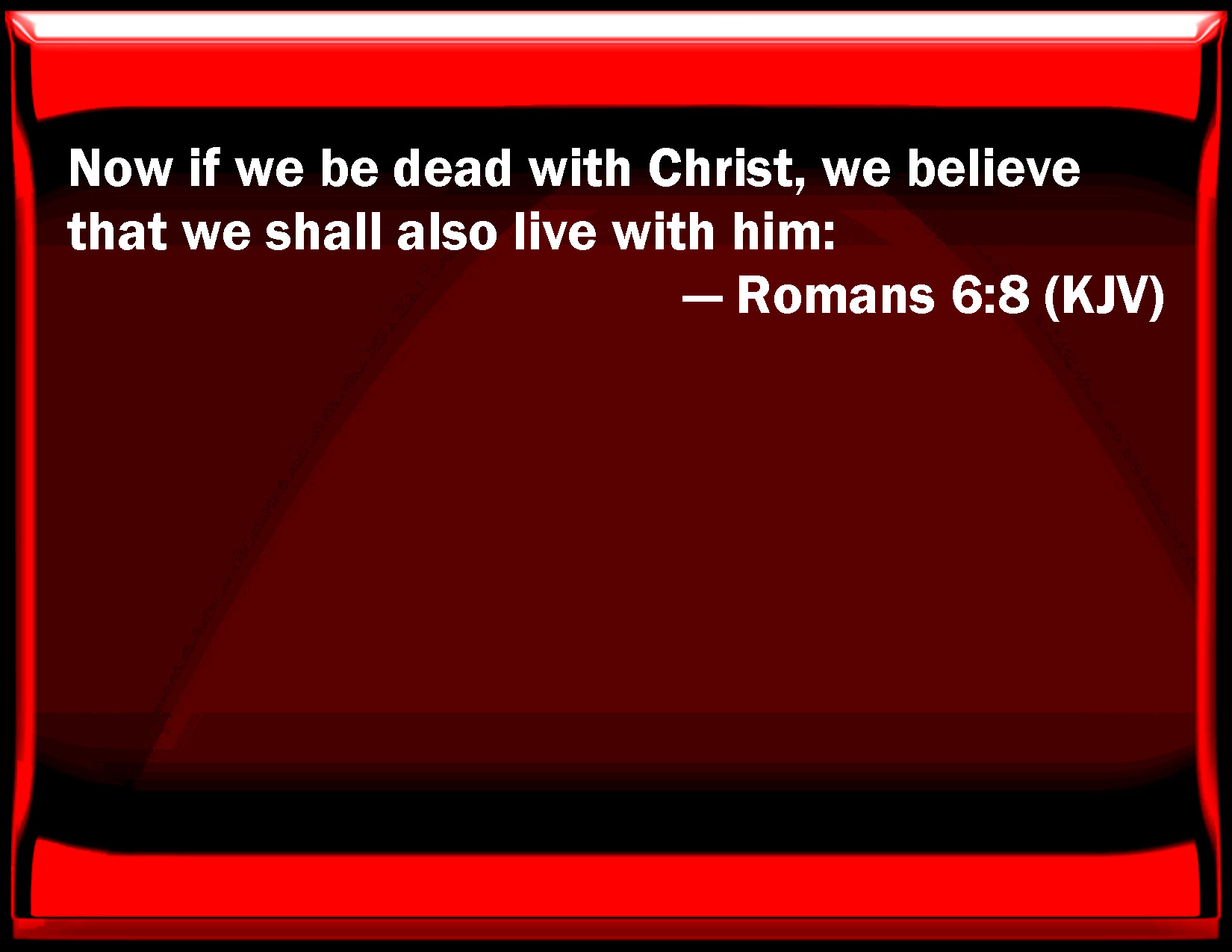 Bible Verse Slide Romans 6:8 Now if we be dead with Christ, we believe that we shall also live with him: KJV: Now if we be dead with Christ, we believe that we shall also live with him: DRB: Now if we be dead with Christ, we believe that we shall live also together with Christ: DBT: Now if we have died with Christ, we believe that we shall also live with him, ERV: But if we died with Christ, we believe that we shall also live with him; WBT: Now if we are dead with Christ, we believe that we shall also live with him: WEB: But if we died with Christ, we believe that we will also live with him; YLT: And if we died with Christ, we believe that we also shall live with him,Links Romans 6:8 NIV • Romans 6:8 NLT • Romans 6:8 ESV • Romans 6:8 NASB • Romans 6:8 KJV • Romans 6:8 Interlinear • Romans 6:8 Commentaries • Romans 6:8 Parallel Texts • Romans 6:8 Bible Apps • Romans 6:8 Parallel • Bible Hub |