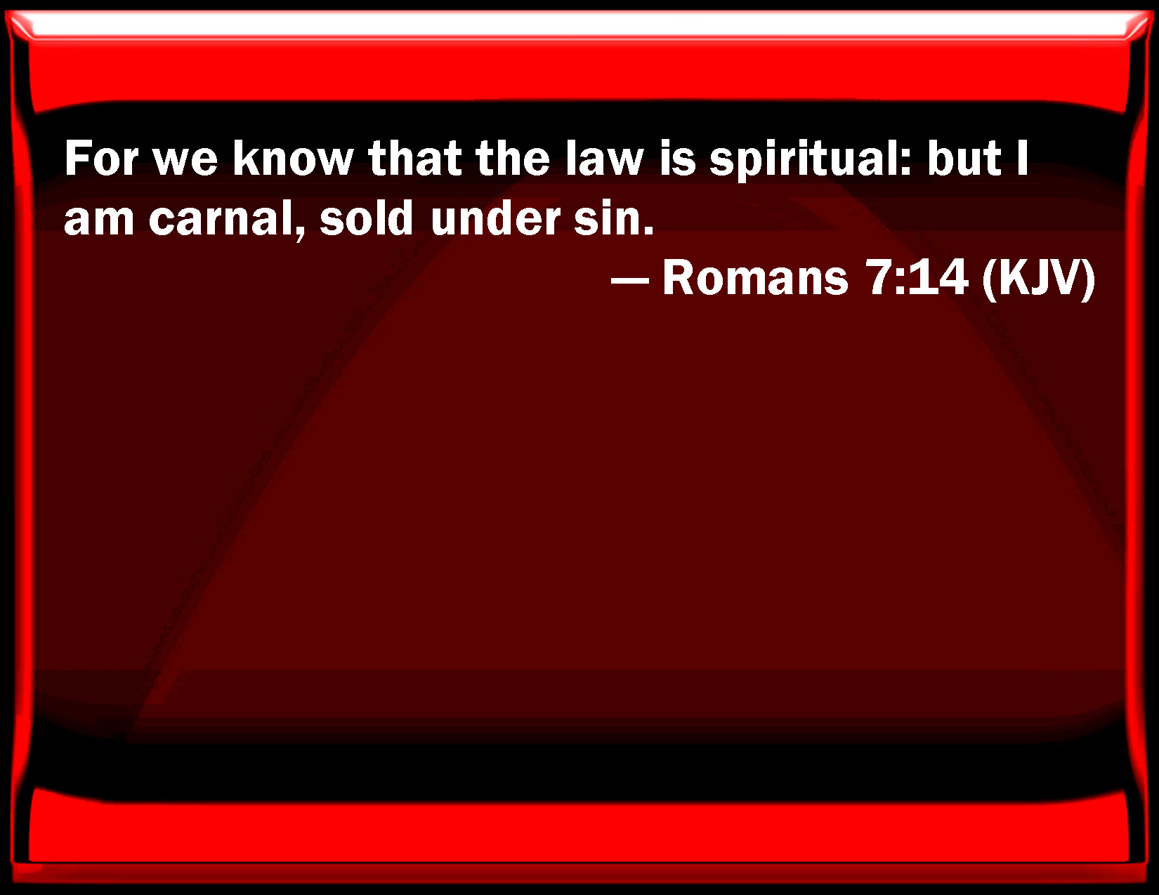 Bible Verse Slide Romans 7:14 For we know that the law is spiritual: but I am carnal, sold under sin. KJV: For we know that the law is spiritual: but I am carnal, sold under sin. DRB: For we know that the law is spiritual; but I am carnal, sold under sin. DBT: For we know that the law is spiritual: but I am fleshly, sold under sin. ERV: For we know that the law is spiritual: but I am carnal, sold under sin. WBT: For we know that the law is spiritual: but I am carnal, sold under sin. WEB: For we know that the law is spiritual, but I am fleshly, sold under sin. YLT: for we have known that the law is spiritual, and I am fleshly, sold by the sin;Links Romans 7:14 NIV • Romans 7:14 NLT • Romans 7:14 ESV • Romans 7:14 NASB • Romans 7:14 KJV • Romans 7:14 Interlinear • Romans 7:14 Commentaries • Romans 7:14 Parallel Texts • Romans 7:14 Bible Apps • Romans 7:14 Parallel • Bible Hub |