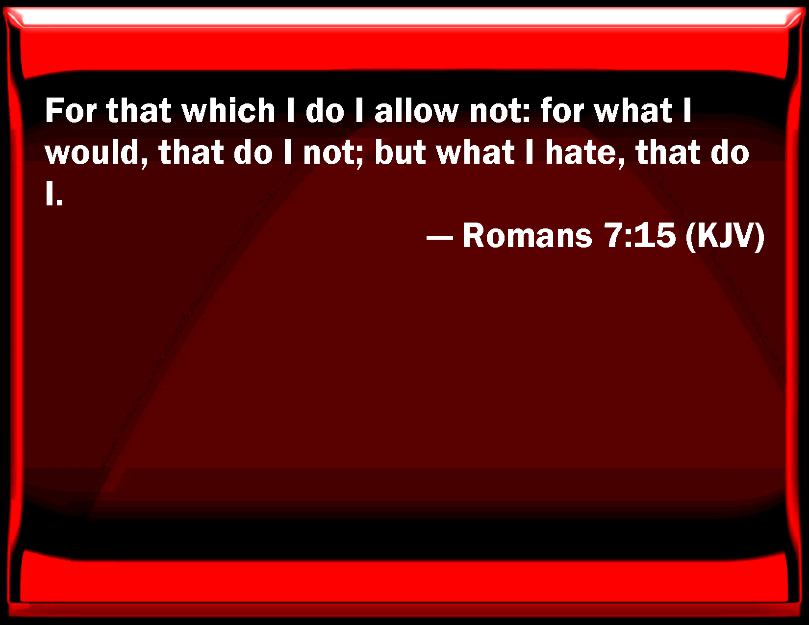 Bible Verse Slide Romans 7:15 For that which I do I allow not: for what I would, that do I not; but what I hate, that do I. KJV: For that which I do I allow not: for what I would, that do I not; but what I hate, that do I. DRB: For that which I work, I understand not. For I do not that good which I will; but the evil which I hate, that I do. DBT: For that which I do, I do not own: for not what I will, this I do; but what I hate, this I practise. ERV: For that which I do I know not: for not what I would, that do I practise; but what I hate, that I do. WBT: For that which I do, I allow not: for what I would, that I do not; but what I hate, that I do. WEB: For I don't know what I am doing. For I don't practice what I desire to do; but what I hate, that I do. YLT: for that which I work, I do not acknowledge; for not what I will, this I practise, but what I hate, this I do.Links Romans 7:15 NIV • Romans 7:15 NLT • Romans 7:15 ESV • Romans 7:15 NASB • Romans 7:15 KJV • Romans 7:15 Interlinear • Romans 7:15 Commentaries • Romans 7:15 Parallel Texts • Romans 7:15 Bible Apps • Romans 7:15 Parallel • Bible Hub |