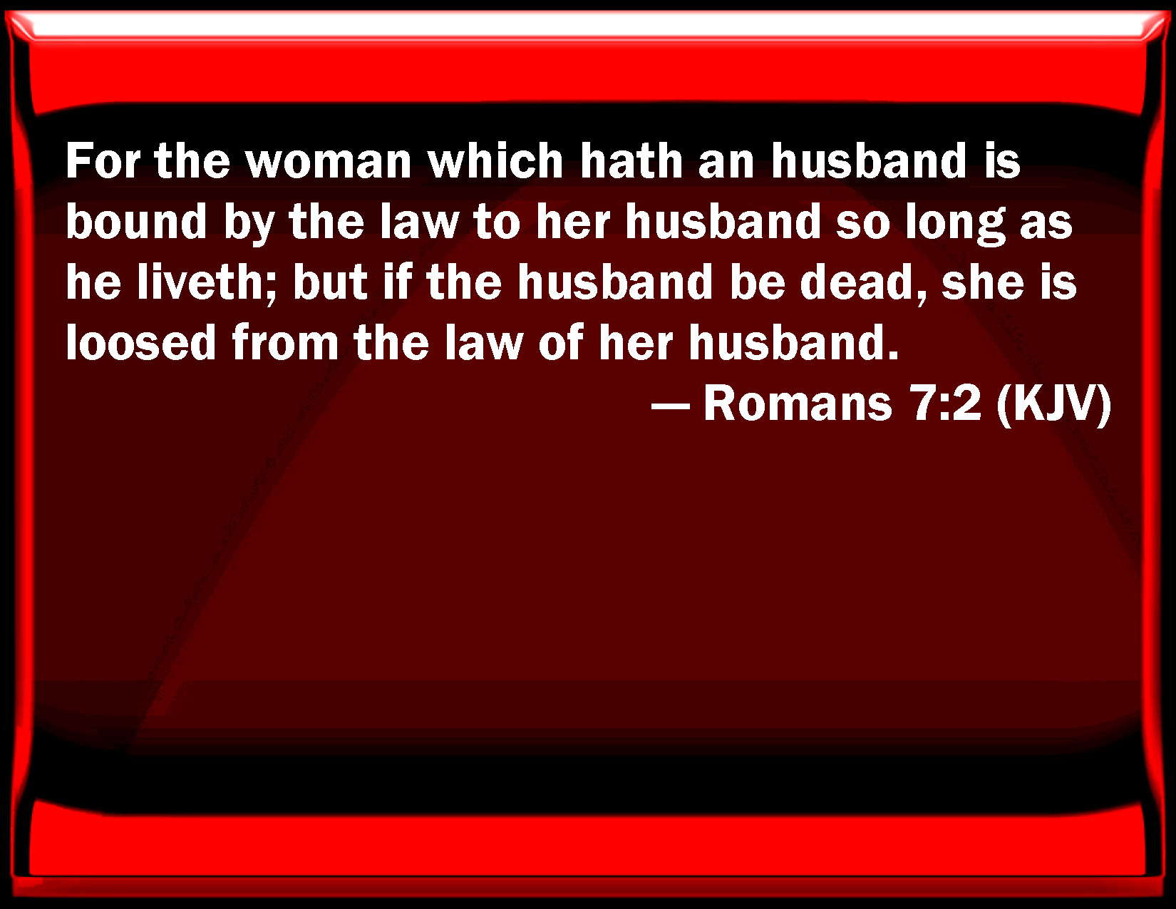 Bible Verse Slide Romans 7:2 For the woman which has an husband is bound by the law to her husband so long as he lives; but if the husband be dead, she is loosed from the law of her husband. KJV: For the woman which hath an husband is bound by the law to her husband so long as he liveth; but if the husband be dead, she is loosed from the law of her husband. DRB: For the woman that hath an husband, whilst her husband liveth is bound to the law. But if her husband be dead, she is loosed from the law of her husband. DBT: For the married woman is bound by law to her husband so long as he is alive; but if the husband should die, she is clear from the law of the husband: ERV: For the woman that hath a husband is bound by law to the husband while he liveth; but if the husband die, she is discharged from the law of the husband. WBT: For the woman who hath a husband, is bound by the law to her husband so long as he liveth; but if the husband is dead, she is loosed from the law of her husband. WEB: For the woman that has a husband is bound by law to the husband while he lives, but if the husband dies, she is discharged from the law of the husband. YLT: for the married woman to the living husband hath been bound by law, and if the husband may die, she hath been free from the law of the husband;Links Romans 7:2 NIV • Romans 7:2 NLT • Romans 7:2 ESV • Romans 7:2 NASB • Romans 7:2 KJV • Romans 7:2 Interlinear • Romans 7:2 Commentaries • Romans 7:2 Parallel Texts • Romans 7:2 Bible Apps • Romans 7:2 Parallel • Bible Hub |