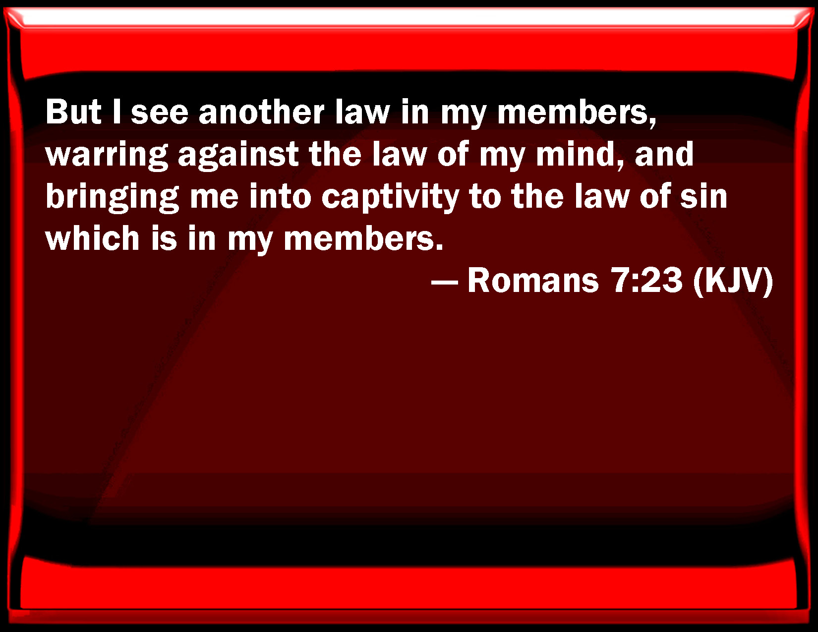 Bible Verse Slide Romans 7:23 But I see another law in my members, warring against the law of my mind, and bringing me into captivity to the law of sin which is in my members. KJV: But I see another law in my members, warring against the law of my mind, and bringing me into captivity to the law of sin which is in my members. DRB: But I see another law in my members, fighting against the law of my mind, and captivating me in the law of sin, that is in my members. DBT: but I see another law in my members, warring in opposition to the law of my mind, and bringing me into captivity to the law of sin which exists in my members. ERV: but I see a different law in my members, warring against the law of my mind, and bringing me into captivity under the law of sin which is in my members. WBT: But I see another law in my members warring against the law of my mind, and bringing me into captivity to the law of sin which is in my members. WEB: but I see a different law in my members, warring against the law of my mind, and bringing me into captivity under the law of sin which is in my members. YLT: and I behold another law in my members, warring against the law of my mind, and bringing me into captivity to the law of the sin that is in my members.Links Romans 7:23 NIV • Romans 7:23 NLT • Romans 7:23 ESV • Romans 7:23 NASB • Romans 7:23 KJV • Romans 7:23 Interlinear • Romans 7:23 Commentaries • Romans 7:23 Parallel Texts • Romans 7:23 Bible Apps • Romans 7:23 Parallel • Bible Hub |
