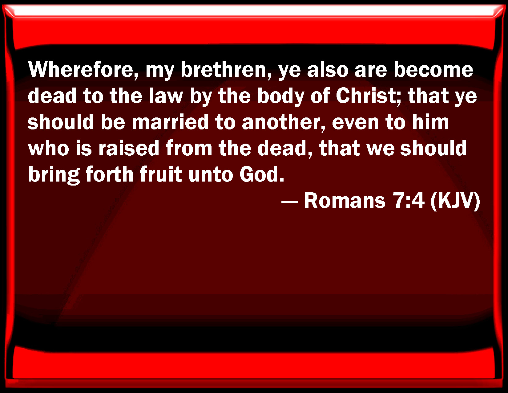 Bible Verse Slide Romans 7:4 Why, my brothers, you also are become dead to the law by the body of Christ; that you should be married to another, even to him who is raised from the dead, that we should bring forth fruit to God. KJV: Wherefore, my brethren, ye also are become dead to the law by the body of Christ; that ye should be married to another, even to him who is raised from the dead, that we should bring forth fruit unto God. DRB: Therefore, my brethren, you also are become dead to the law, by the body of Christ; that you may belong to another, who is risen again from the dead, that we may bring forth fruit to God. DBT: So that, my brethren, ye also have been made dead to the law by the body of the Christ, to be to another, who has been raised up from among the dead, in order that we might bear fruit to God. ERV: Wherefore, my brethren, ye also were made dead to the law through the body of Christ; that ye should be joined to another, even to him who was raised from the dead, that we might bring forth fruit unto God. WBT: Wherefore, my brethren, ye also are become dead to the law by the body of Christ; that ye should be married to another, even to him who is raised from the dead, that we should bring forth fruit to God. WEB: Therefore, my brothers, you also were made dead to the law through the body of Christ, that you would be joined to another, to him who was raised from the dead, that we might bring forth fruit to God. YLT: So that, my brethren, ye also were made dead to the law through the body of the Christ, for your becoming another's, who out of the dead was raised up, that we might bear fruit to God;Links Romans 7:4 NIV • Romans 7:4 NLT • Romans 7:4 ESV • Romans 7:4 NASB • Romans 7:4 KJV • Romans 7:4 Interlinear • Romans 7:4 Commentaries • Romans 7:4 Parallel Texts • Romans 7:4 Bible Apps • Romans 7:4 Parallel • Bible Hub |