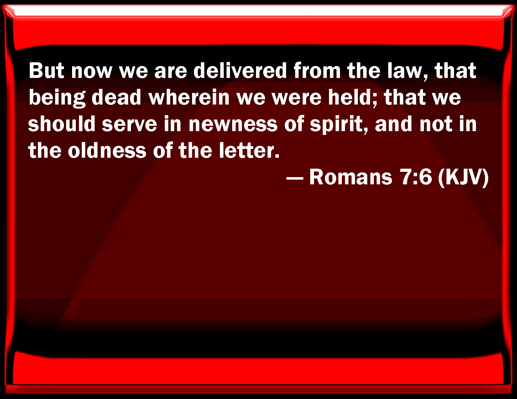 Bible Verse Slide Romans 7:6 But now we are delivered from the law, that being dead wherein we were held; that we should serve in newness of spirit, and not in the oldness of the letter. KJV: But now we are delivered from the law, that being dead wherein we were held; that we should serve in newness of spirit, and not in the oldness of the letter. DRB: But now we are loosed from the law of death, wherein we were detained; so that we should serve in newness of spirit, and not in the oldness of the letter. DBT: but now we are clear from the law, having died in that in which we were held, so that we should serve in newness of spirit, and not in oldness of letter. ERV: But now we have been discharged from the law, having died to that wherein we were holden; so that we serve in newness of the spirit, and not in oldness of the letter. WBT: But now we are delivered from the law, that being dead by which we were held; that we should serve in newness of spirit, and not in the oldness of the letter. WEB: But now we have been discharged from the law, having died to that in which we were held; so that we serve in newness of the spirit, and not in oldness of the letter. YLT: and now we have ceased from the law, that being dead in which we were held, so that we may serve in newness of spirit, and not in oldness of letter.Links Romans 7:6 NIV • Romans 7:6 NLT • Romans 7:6 ESV • Romans 7:6 NASB • Romans 7:6 KJV • Romans 7:6 Interlinear • Romans 7:6 Commentaries • Romans 7:6 Parallel Texts • Romans 7:6 Bible Apps • Romans 7:6 Parallel • Bible Hub |