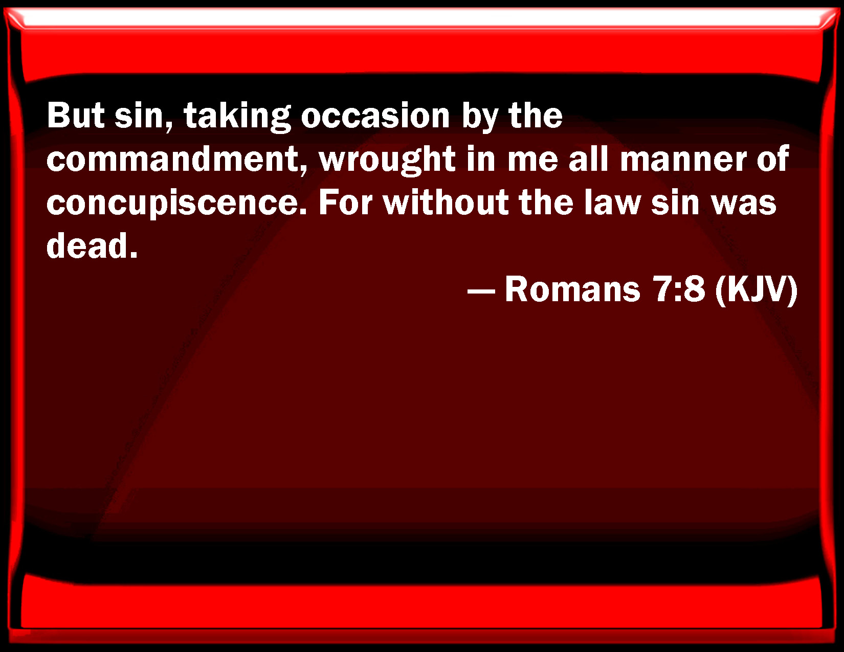 Bible Verse Slide Romans 7:8 But sin, taking occasion by the commandment, worked in me all manner of concupiscence. For without the law sin was dead. KJV: But sin, taking occasion by the commandment, wrought in me all manner of concupiscence. For without the law sin was dead. DRB: But sin taking occasion by the commandment, wrought in me all manner of concupiscence. For without the law sin was dead. DBT: but sin, getting a point of attack by the commandment, wrought in me every lust; for without law sin was dead. ERV: but sin, finding occasion, wrought in me through the commandment all manner of coveting: for apart from the law sin is dead. WBT: But sin, taking occasion by the commandment, wrought in me all manner of concupiscence. For without the law sin was dead. WEB: But sin, finding occasion through the commandment, produced in me all kinds of coveting. For apart from the law, sin is dead. YLT: Thou shalt not covet;' and the sin having received an opportunity, through the command, did work in me all covetousness — for apart from law sin is dead.Links Romans 7:8 NIV • Romans 7:8 NLT • Romans 7:8 ESV • Romans 7:8 NASB • Romans 7:8 KJV • Romans 7:8 Interlinear • Romans 7:8 Commentaries • Romans 7:8 Parallel Texts • Romans 7:8 Bible Apps • Romans 7:8 Parallel • Bible Hub |
