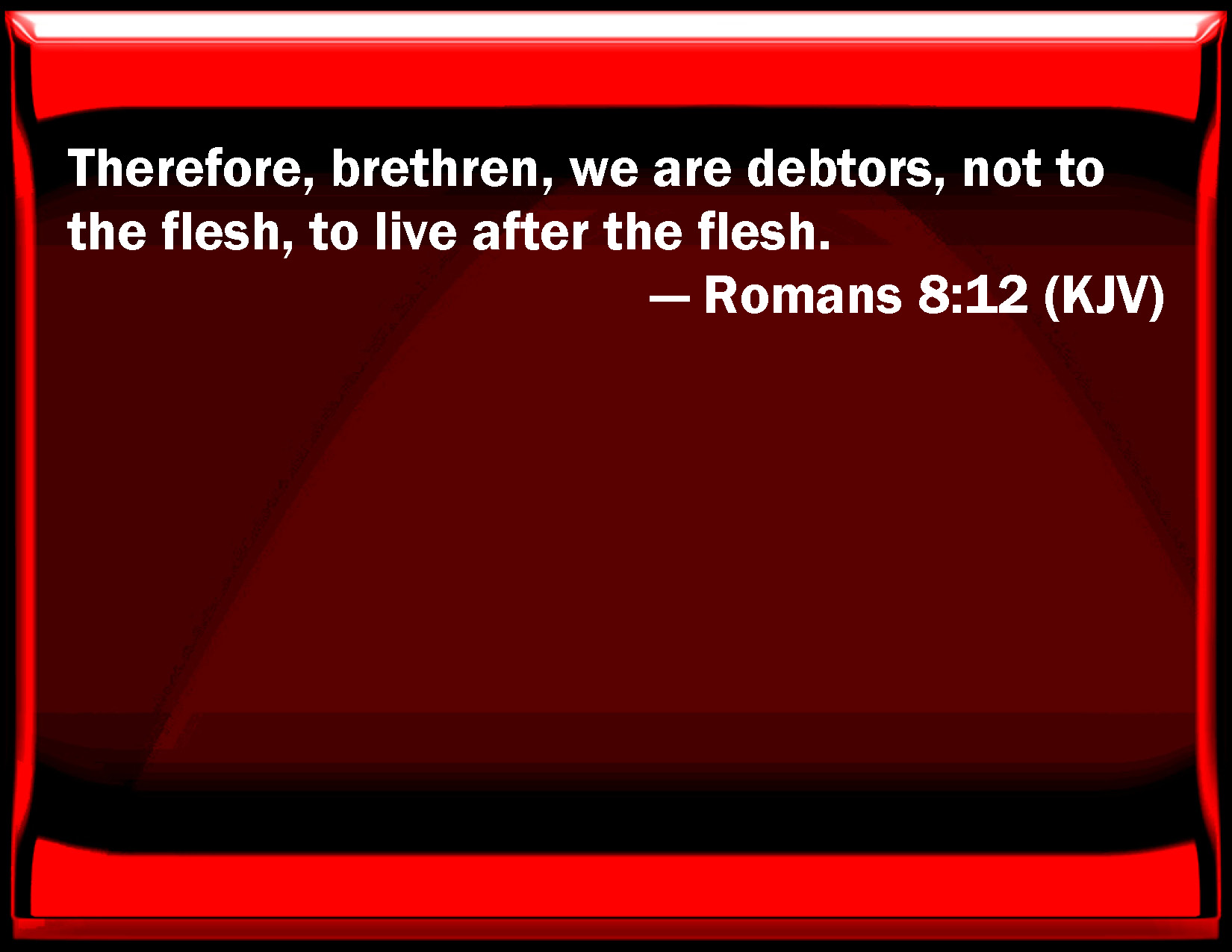 Bible Verse Slide Romans 8:12 Therefore, brothers, we are debtors, not to the flesh, to live after the flesh. KJV: Therefore, brethren, we are debtors, not to the flesh, to live after the flesh. DRB: Therefore, brethren, we are debtors, not to the flesh, to live according to the flesh. DBT: So then, brethren, we are debtors, not to the flesh, to live according to flesh; ERV: So then, brethren, we are debtors, not to the flesh, to live after the flesh: WBT: Therefore, brethren, we are debtors, not to the flesh, to live according to the flesh. WEB: So then, brothers, we are debtors, not to the flesh, to live after the flesh. YLT: So, then, brethren, we are debtors, not to the flesh, to live according to the flesh;Links Romans 8:12 NIV • Romans 8:12 NLT • Romans 8:12 ESV • Romans 8:12 NASB • Romans 8:12 KJV • Romans 8:12 Interlinear • Romans 8:12 Commentaries • Romans 8:12 Parallel Texts • Romans 8:12 Bible Apps • Romans 8:12 Parallel • Bible Hub |