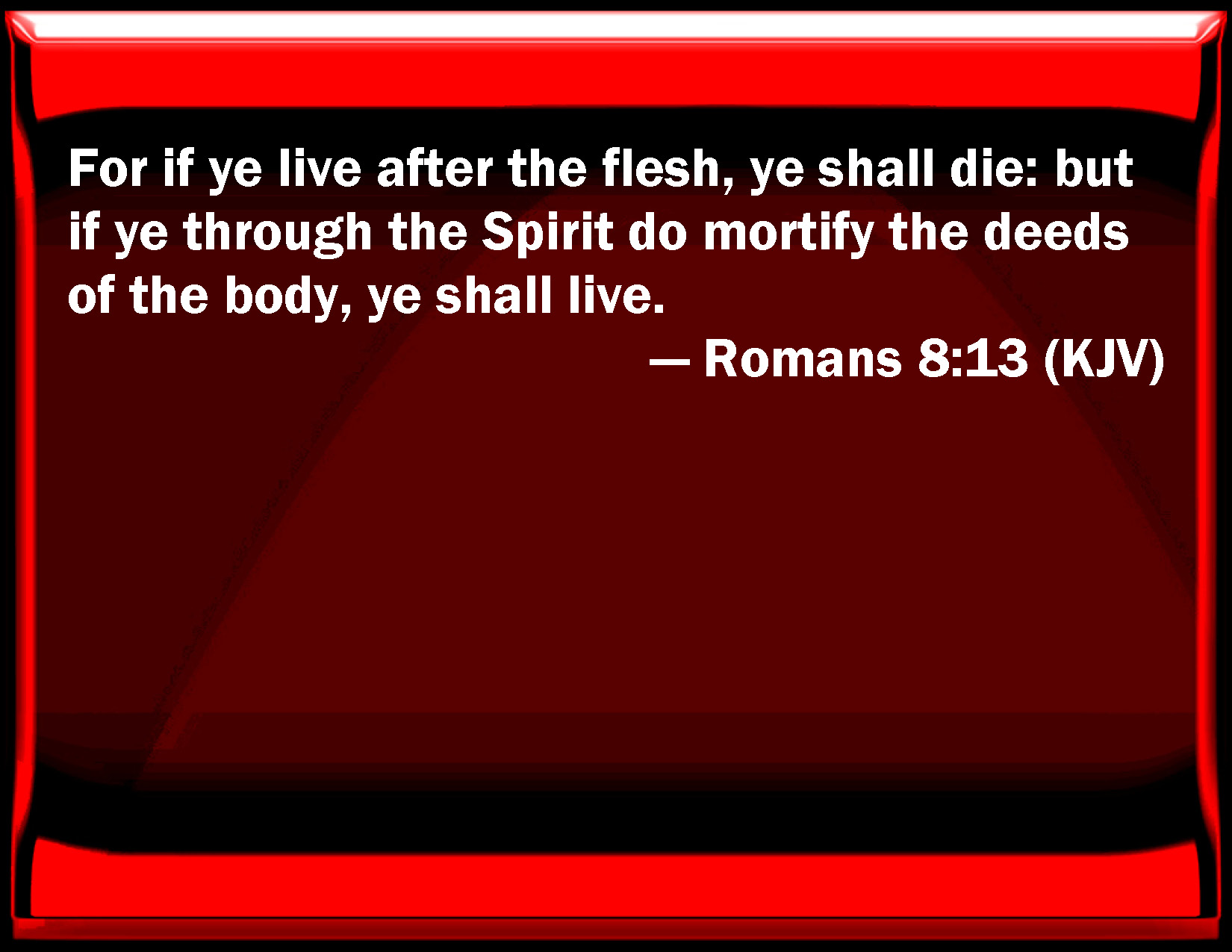 Bible Verse Slide Romans 8:13 For if you live after the flesh, you shall die: but if you through the Spirit do mortify the deeds of the body, you shall live. KJV: For if ye live after the flesh, ye shall die: but if ye through the Spirit do mortify the deeds of the body, ye shall live. DRB: For if you live according to the flesh, you shall die: but if by the Spirit you mortify the deeds of the flesh, you shall live. DBT: for if ye live according to flesh, ye are about to die; but if, by the Spirit, ye put to death the deeds of the body, ye shall live: ERV: for if ye live after the flesh, ye must die; but if by the spirit ye mortify the deeds of the body, ye shall live. WBT: For if ye live according to the flesh, ye shall die: but if ye through the Spirit mortify the deeds of the body, ye shall live. WEB: For if you live after the flesh, you must die; but if by the Spirit you put to death the deeds of the body, you will live. YLT: for if according to the flesh ye do live, ye are about to die; and if, by the Spirit, the deeds of the body ye put to death, ye shall live;Links Romans 8:13 NIV • Romans 8:13 NLT • Romans 8:13 ESV • Romans 8:13 NASB • Romans 8:13 KJV • Romans 8:13 Interlinear • Romans 8:13 Commentaries • Romans 8:13 Parallel Texts • Romans 8:13 Bible Apps • Romans 8:13 Parallel • Bible Hub |