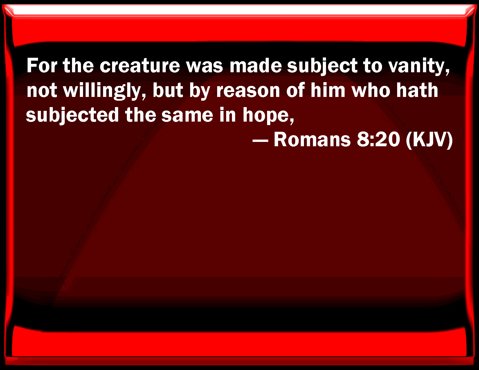 Bible Verse Slide Romans 8:20 For the creature was made subject to vanity, not willingly, but by reason of him who has subjected the same in hope, KJV: For the creature was made subject to vanity, not willingly, but by reason of him who hath subjected the same in hope, DRB: For the creature was made subject to vanity, not willingly, but by reason of him that made it subject, in hope: DBT: for the creature has been made subject to vanity, not of its will, but by reason of him who has subjected the same, in hope ERV: For the creation was subjected to vanity, not of its own will, but by reason of him who subjected it, in hope WBT: For the creature was made subject to vanity, not willingly, but by reason of him who hath subjected the same in hope: WEB: For the creation was subjected to vanity, not of its own will, but because of him who subjected it, in hope YLT: for to vanity was the creation made subject — not of its will, but because of Him who did subject it — in hope,Links Romans 8:20 NIV • Romans 8:20 NLT • Romans 8:20 ESV • Romans 8:20 NASB • Romans 8:20 KJV • Romans 8:20 Interlinear • Romans 8:20 Commentaries • Romans 8:20 Parallel Texts • Romans 8:20 Bible Apps • Romans 8:20 Parallel • Bible Hub |