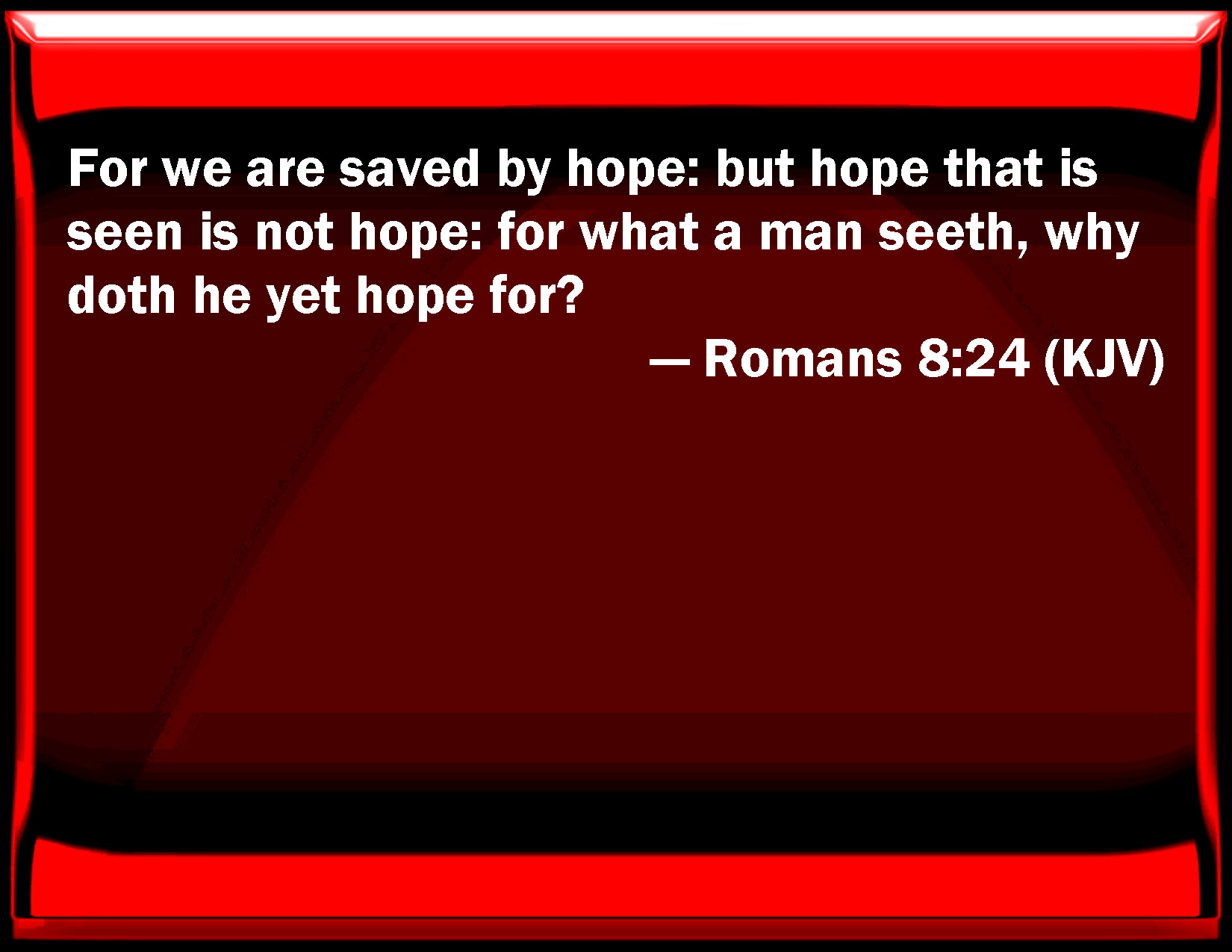 Bible Verse Slide Romans 8:24 For we are saved by hope: but hope that is seen is not hope: for what a man sees, why does he yet hope for? KJV: For we are saved by hope: but hope that is seen is not hope: for what a man seeth, why doth he yet hope for? DRB: For we are saved by hope. But hope that is seen, is not hope. For what a man seeth, why doth he hope for? DBT: For we have been saved in hope; but hope seen is not hope; for what any one sees, why does he also hope? ERV: For by hope were we saved: but hope that is seen is not hope: for who hopeth for that which he seeth? WBT: For we are saved by hope: But hope that is seen, is not hope: for what a man seeth, why doth he yet hope for? WEB: For we were saved in hope, but hope that is seen is not hope. For who hopes for that which he sees? YLT: for in hope we were saved, and hope beheld is not hope; for what any one doth behold, why also doth he hope for it?Links Romans 8:24 NIV • Romans 8:24 NLT • Romans 8:24 ESV • Romans 8:24 NASB • Romans 8:24 KJV • Romans 8:24 Interlinear • Romans 8:24 Commentaries • Romans 8:24 Parallel Texts • Romans 8:24 Bible Apps • Romans 8:24 Parallel • Bible Hub |