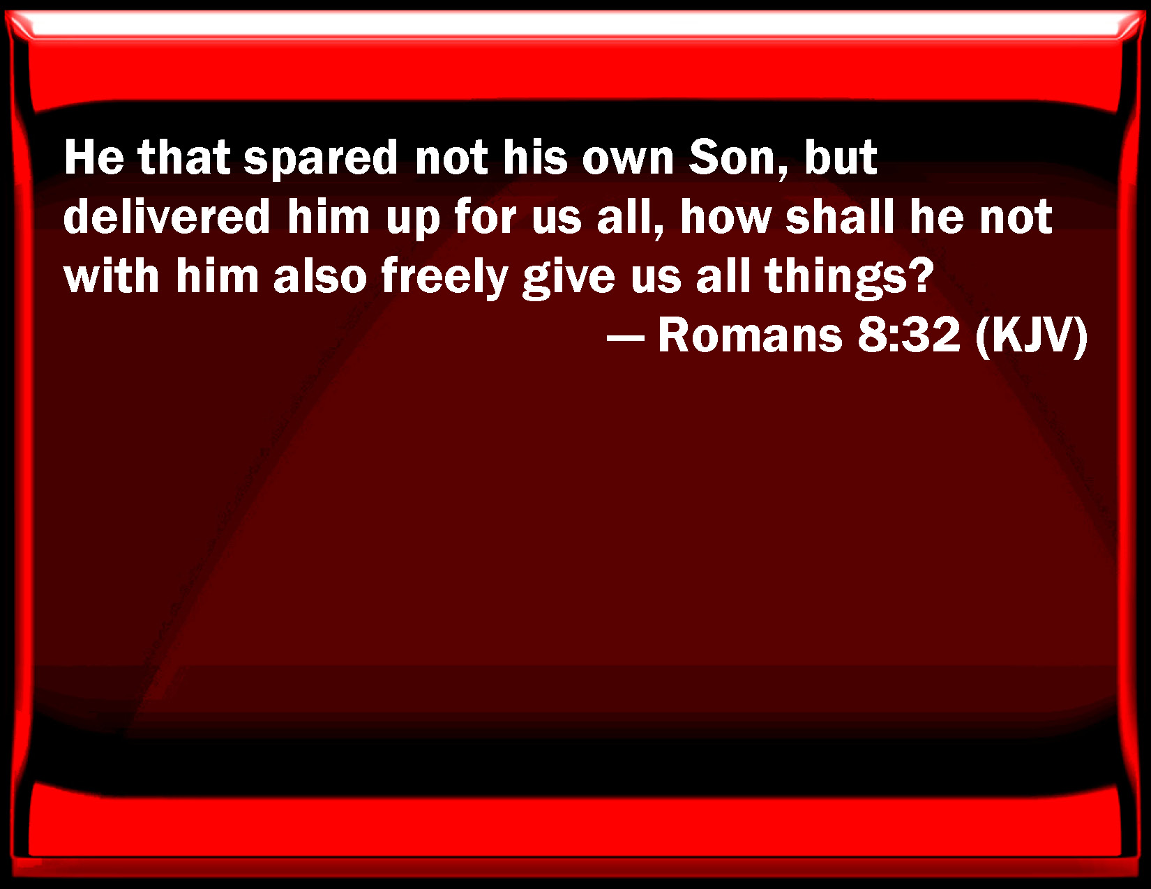 Bible Verse Slide Romans 8:32 He that spared not his own Son, but delivered him up for us all, how shall he not with him also freely give us all things? KJV: He that spared not his own Son, but delivered him up for us all, how shall he not with him also freely give us all things? DRB: He that spared not even his own Son, but delivered him up for us all, how hath he not also, with him, given us all things? DBT: He who, yea, has not spared his own Son, but delivered him up for us all, how shall he not also with him grant us all things? ERV: He that spared not his own Son, but delivered him up for us all, how shall he not also with him freely give us all things? WBT: He that spared not his own Son, but delivered him up for us all, how shall he not with him also freely give us all things? WEB: He who didn't spare his own Son, but delivered him up for us all, how would he not also with him freely give us all things? YLT: He who indeed His own Son did not spare, but for us all did deliver him up, how shall He not also with him the all things grant to us?Links Romans 8:32 NIV • Romans 8:32 NLT • Romans 8:32 ESV • Romans 8:32 NASB • Romans 8:32 KJV • Romans 8:32 Interlinear • Romans 8:32 Commentaries • Romans 8:32 Parallel Texts • Romans 8:32 Bible Apps • Romans 8:32 Parallel • Bible Hub |
