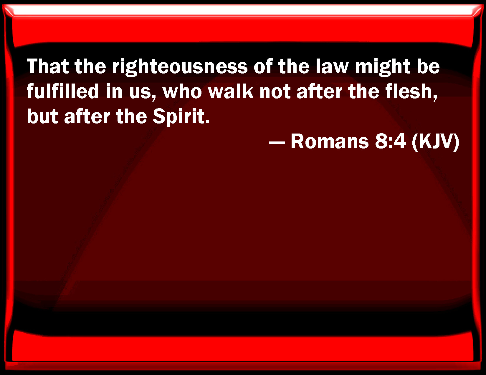 Bible Verse Slide Romans 8:4 That the righteousness of the law might be fulfilled in us, who walk not after the flesh, but after the Spirit. KJV: That the righteousness of the law might be fulfilled in us, who walk not after the flesh, but after the Spirit. DRB: That the justification of the law might be fulfilled in us, who walk not according to the flesh, but according to the spirit. DBT: in order that the righteous requirement of the law should be fulfilled in us, who do not walk according to flesh but according to Spirit. ERV: that the ordinance of the law might be fulfilled in us, who walk not after the flesh, but after the spirit. WBT: That the righteousness of the law may be fulfilled in us, who walk not according to the flesh, but according to the Spirit. WEB: that the ordinance of the law might be fulfilled in us, who walk not after the flesh, but after the Spirit. YLT: that the righteousness of the law may be fulfilled in us, who do not walk according to the flesh, but according to the Spirit.Links Romans 8:4 NIV • Romans 8:4 NLT • Romans 8:4 ESV • Romans 8:4 NASB • Romans 8:4 KJV • Romans 8:4 Interlinear • Romans 8:4 Commentaries • Romans 8:4 Parallel Texts • Romans 8:4 Bible Apps • Romans 8:4 Parallel • Bible Hub |