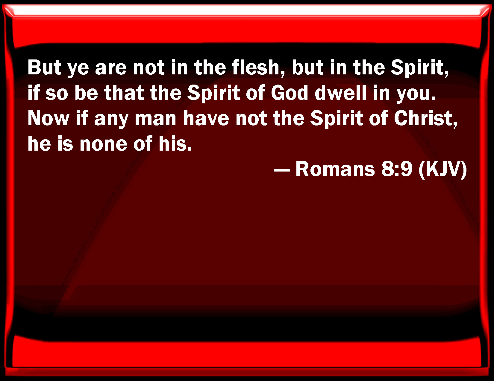 Bible Verse Slide Romans 8:9 But you are not in the flesh, but in the Spirit, if so be that the Spirit of God dwell in you. Now if any man have not the Spirit of Christ, he is none of his. KJV: But ye are not in the flesh, but in the Spirit, if so be that the Spirit of God dwell in you. Now if any man have not the Spirit of Christ, he is none of his. DRB: But you are not in the flesh, but in the spirit, if so be that the Spirit of God dwell in you. Now if any man have not the Spirit of Christ, he is none of his. DBT: But ye are not in flesh but in Spirit, if indeed God's Spirit dwell in you; but if any one has not the Spirit of Christ he is not of him: ERV: But ye are not in the flesh, but in the spirit, if so be that the Spirit of God dwelleth in you. But if any man hath not the Spirit of Christ, he is none of his. WBT: But ye are not in the flesh, but in the Spirit, if the Spirit of God dwelleth in you. Now if any man hath not the Spirit of Christ, he is not his. WEB: But you are not in the flesh but in the Spirit, if it is so that the Spirit of God dwells in you. But if any man doesn't have the Spirit of Christ, he is not his. YLT: And ye are not in the flesh, but in the Spirit, if indeed the Spirit of God doth dwell in you; and if any one hath not the Spirit of Christ — this one is not His;Links Romans 8:9 NIV • Romans 8:9 NLT • Romans 8:9 ESV • Romans 8:9 NASB • Romans 8:9 KJV • Romans 8:9 Interlinear • Romans 8:9 Commentaries • Romans 8:9 Parallel Texts • Romans 8:9 Bible Apps • Romans 8:9 Parallel • Bible Hub |