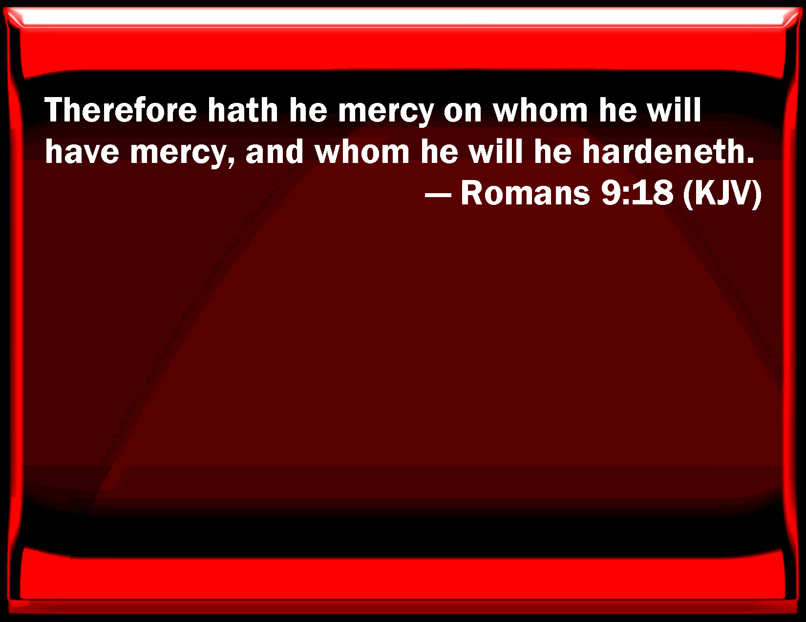 Bible Verse Slide Romans 9:18 Therefore has he mercy on whom he will have mercy, and whom he will he hardens. KJV: Therefore hath he mercy on whom he will have mercy, and whom he will he hardeneth. DRB: Therefore he hath mercy on whom he will; and whom he will, he hardeneth. DBT: So then, to whom he will he shews mercy, and whom he will he hardens. ERV: So then he hath mercy on whom he will, and whom he will he hardeneth. WBT: Therefore he hath mercy on whom he will have mercy, and whom he will he hardeneth. WEB: So then, he has mercy on whom he desires, and he hardens whom he desires. YLT: so, then, to whom He willeth, He doth kindness, and to whom He willeth, He doth harden.Links Romans 9:18 NIV • Romans 9:18 NLT • Romans 9:18 ESV • Romans 9:18 NASB • Romans 9:18 KJV • Romans 9:18 Interlinear • Romans 9:18 Commentaries • Romans 9:18 Parallel Texts • Romans 9:18 Bible Apps • Romans 9:18 Parallel • Bible Hub |