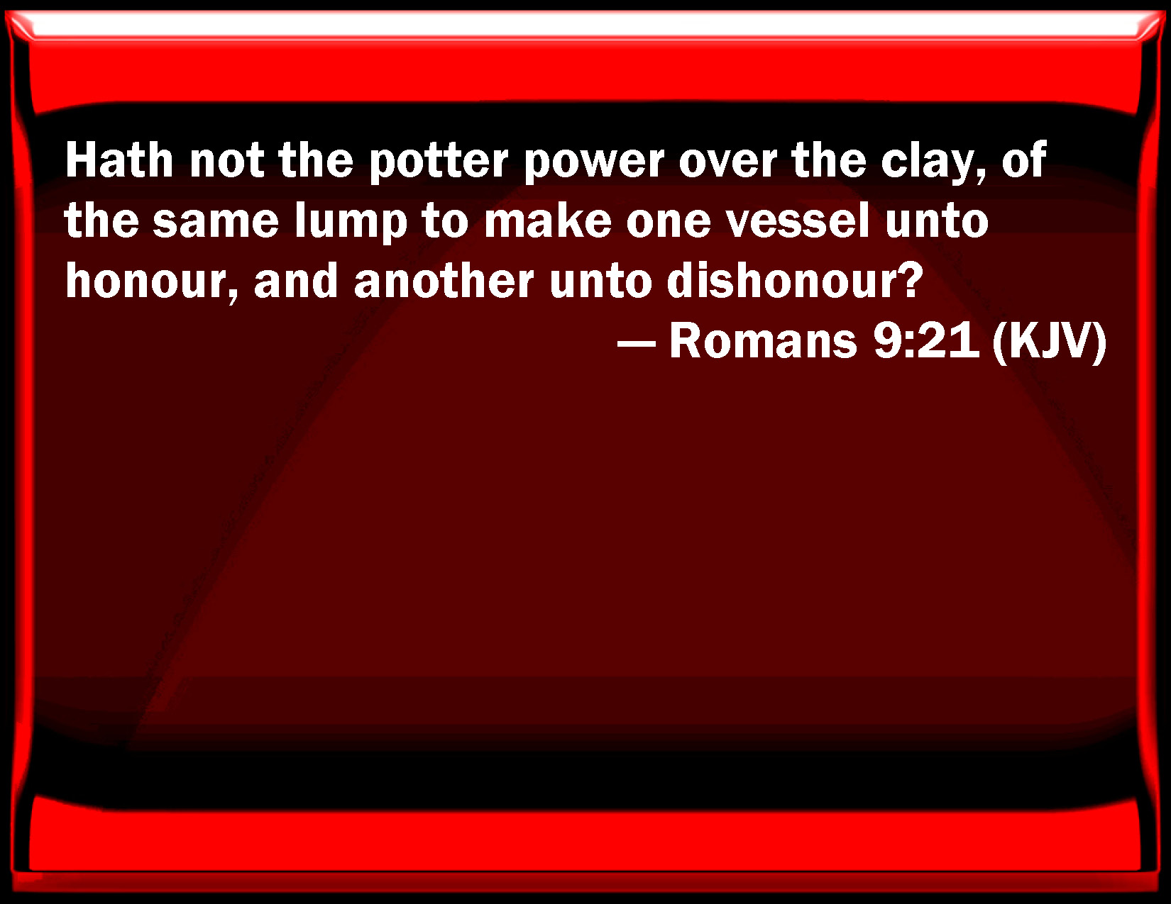 Bible Verse Slide Romans 9:21 Has not the potter power over the clay, of the same lump to make one vessel to honor, and another to dishonor? KJV: Hath not the potter power over the clay, of the same lump to make one vessel unto honour, and another unto dishonour? DRB: Or hath not the potter power over the clay, of the same lump, to make one vessel unto honour, and another unto dishonour? DBT: Or has not the potter authority over the clay, out of the same lump to make one vessel to honour, and another to dishonour? ERV: Or hath not the potter a right over the clay, from the same lump to make one part a vessel unto honour, and another unto dishonour? WBT: Hath not the potter power over the clay of the same lump to make one vessel to honor, and another to dishonor? WEB: Or hasn't the potter a right over the clay, from the same lump to make one part a vessel for honor, and another for dishonor? YLT: hath not the potter authority over the clay, out of the same lump to make the one vessel to honour, and the one to dishonour?Links Romans 9:21 NIV • Romans 9:21 NLT • Romans 9:21 ESV • Romans 9:21 NASB • Romans 9:21 KJV • Romans 9:21 Interlinear • Romans 9:21 Commentaries • Romans 9:21 Parallel Texts • Romans 9:21 Bible Apps • Romans 9:21 Parallel • Bible Hub |