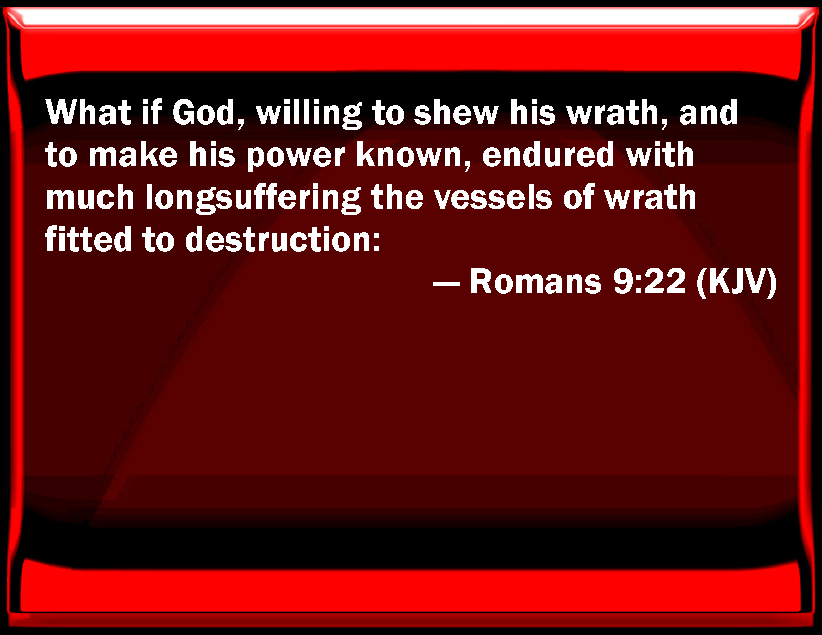 Bible Verse Slide Romans 9:22 What if God, willing to show his wrath, and to make his power known, endured with much long-suffering the vessels of wrath fitted to destruction: KJV: What if God, willing to shew his wrath, and to make his power known, endured with much longsuffering the vessels of wrath fitted to destruction: DRB: What if God, willing to shew his wrath, and to make his power known, endured with much patience vessels of wrath, fitted for destruction, DBT: And if God, minded to shew his wrath and to make his power known, endured with much long-suffering vessels of wrath fitted for destruction; ERV: What if God, willing to shew his wrath, and to make his power known, endured with much longsuffering vessels of wrath fitted unto destruction: WBT: What if God, willing to show his wrath, and to make his power known, endured with much long-suffering the vessels of wrath fitted to destruction: WEB: What if God, willing to show his wrath, and to make his power known, endured with much patience vessels of wrath made for destruction, YLT: And if God, willing to shew the wrath and to make known His power, did endure, in much long suffering, vessels of wrath fitted for destruction,Links Romans 9:22 NIV • Romans 9:22 NLT • Romans 9:22 ESV • Romans 9:22 NASB • Romans 9:22 KJV • Romans 9:22 Interlinear • Romans 9:22 Commentaries • Romans 9:22 Parallel Texts • Romans 9:22 Bible Apps • Romans 9:22 Parallel • Bible Hub |