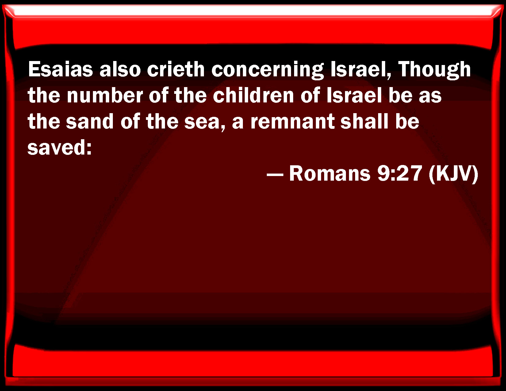 Bible Verse Slide Romans 9:27 Esaias also cries concerning Israel, Though the number of the children of Israel be as the sand of the sea, a remnant shall be saved: KJV: Esaias also crieth concerning Israel, Though the number of the children of Israel be as the sand of the sea, a remnant shall be saved: DRB: And Isaias crieth out concerning Israel: If the number of the children of Israel be as the sand of the sea, a remnant shall be saved. DBT: But Esaias cries concerning Israel, Should the number of the children of Israel be as the sand of the sea, the remnant shall be saved: ERV: And Isaiah crieth concerning Israel, If the number of the children of Israel be as the sand of the sea, it is the remnant that shall be saved: WBT: Isaiah also crieth concerning Israel, Though the number of the children of Israel be as the sand of the sea, a remnant shall be saved: WEB: Isaiah cries concerning Israel, "If the number of the children of Israel are as the sand of the sea, it is the remnant who will be saved; YLT: And Isaiah doth cry concerning Israel, 'If the number of the sons of Israel may be as the sand of the sea, the remnant shall be saved;Links Romans 9:27 NIV • Romans 9:27 NLT • Romans 9:27 ESV • Romans 9:27 NASB • Romans 9:27 KJV • Romans 9:27 Interlinear • Romans 9:27 Commentaries • Romans 9:27 Parallel Texts • Romans 9:27 Bible Apps • Romans 9:27 Parallel • Bible Hub |
