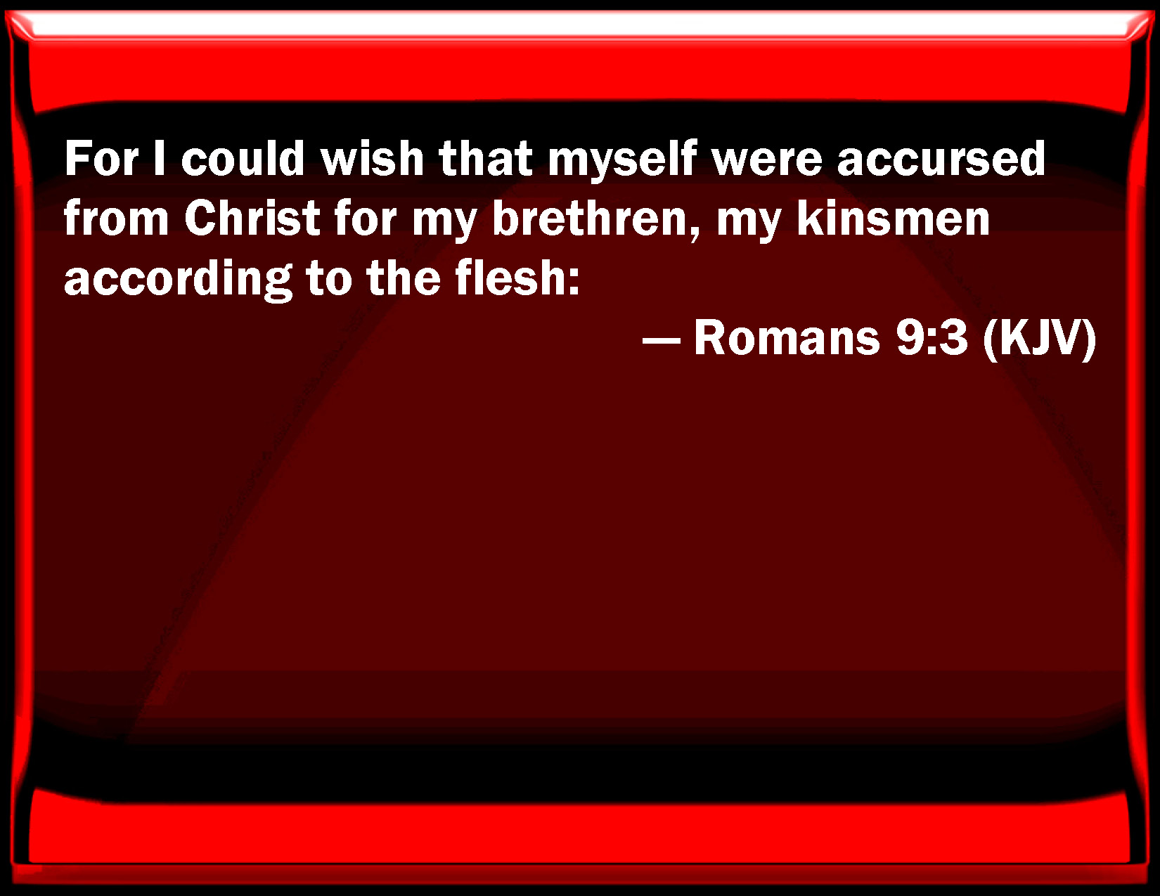 Bible Verse Slide Romans 9:3 For I could wish that myself were accursed from Christ for my brothers, my kinsmen according to the flesh: KJV: For I could wish that myself were accursed from Christ for my brethren, my kinsmen according to the flesh: DRB: For I wished myself to be an anathema from Christ, for my brethren, who are my kinsmen according to the flesh, DBT: for I have wished, I myself, to be a curse from the Christ for my brethren, my kinsmen, according to flesh; ERV: For I could wish that I myself were anathema from Christ for my brethren's sake, my kinsmen according to the flesh: WBT: For I could wish that myself were accursed from Christ, for my brethren, my kinsmen according to the flesh: WEB: For I could wish that I myself were accursed from Christ for my brothers' sake, my relatives according to the flesh, YLT: for I was wishing, I myself, to be anathema from the Christ — for my brethren, my kindred, according to the flesh,Links Romans 9:3 NIV • Romans 9:3 NLT • Romans 9:3 ESV • Romans 9:3 NASB • Romans 9:3 KJV • Romans 9:3 Interlinear • Romans 9:3 Commentaries • Romans 9:3 Parallel Texts • Romans 9:3 Bible Apps • Romans 9:3 Parallel • Bible Hub |