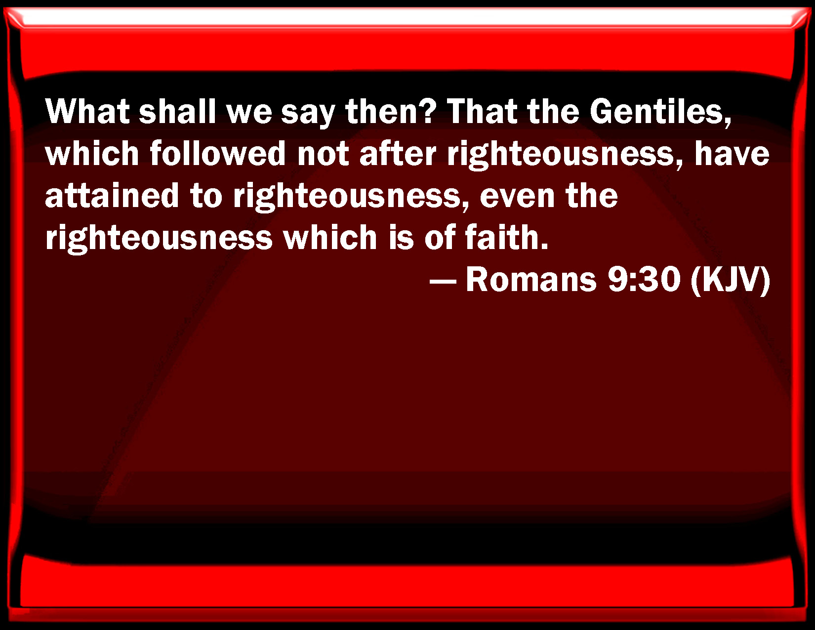 Bible Verse Slide Romans 9:30 What shall we say then? That the Gentiles, which followed not after righteousness, have attained to righteousness, even the righteousness which is of faith. KJV: What shall we say then? That the Gentiles, which followed not after righteousness, have attained to righteousness, even the righteousness which is of faith. DRB: What then shall we say? That the Gentiles, who followed not after justice, have attained to justice, even the justice that is of faith. DBT: What then shall we say? That they of the nations, who did not follow after righteousness, have attained righteousness, but the righteousness that is on the principle of faith. ERV: What shall we say then? That the Gentiles, which followed not after righteousness, attained to righteousness, even the righteousness which is of faith: WBT: What shall we say then? That the Gentiles who followed not after righteousness, have attained to righteousness, even the righteousness which is by faith: WEB: What shall we say then? That the Gentiles, who didn't follow after righteousness, attained to righteousness, even the righteousness which is of faith; YLT: What, then, shall we say? that nations who are not pursuing righteousness did attain to righteousness, and righteousness that is of faith,Links Romans 9:30 NIV • Romans 9:30 NLT • Romans 9:30 ESV • Romans 9:30 NASB • Romans 9:30 KJV • Romans 9:30 Interlinear • Romans 9:30 Commentaries • Romans 9:30 Parallel Texts • Romans 9:30 Bible Apps • Romans 9:30 Parallel • Bible Hub |