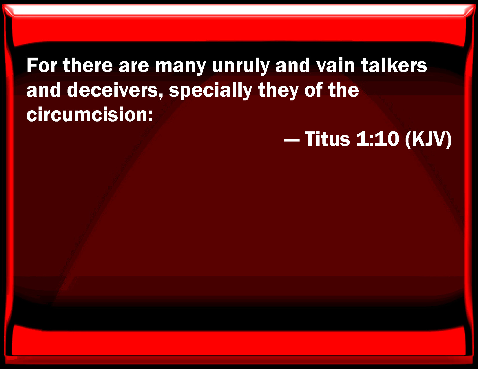 Bible Verse Slide Titus 1:10 For there are many unruly and vain talkers and deceivers, specially they of the circumcision: KJV: For there are many unruly and vain talkers and deceivers, specially they of the circumcision: DRB: For there are also many disobedient, vain talkers, and seducers: especially they who are of the circumcision: DBT: For there are many and disorderly vain speakers and deceivers of people's minds, specially those of the circumcision, ERV: For there are many unruly men, vain talkers and deceivers, specially they of the circumcision, WBT: For there are many disorderly and vain talkers and deceivers, specially they of the circumcision: WEB: For there are also many unruly men, vain talkers and deceivers, especially those of the circumcision, YLT: for there are many both insubordinate, vain-talkers, and mind-deceivers — especially they of the circumcision — Links Titus 1:10 NIV • Titus 1:10 NLT • Titus 1:10 ESV • Titus 1:10 NASB • Titus 1:10 KJV • Titus 1:10 Interlinear • Titus 1:10 Commentaries • Titus 1:10 Parallel Texts • Titus 1:10 Bible Apps • Titus 1:10 Parallel • Bible Hub |