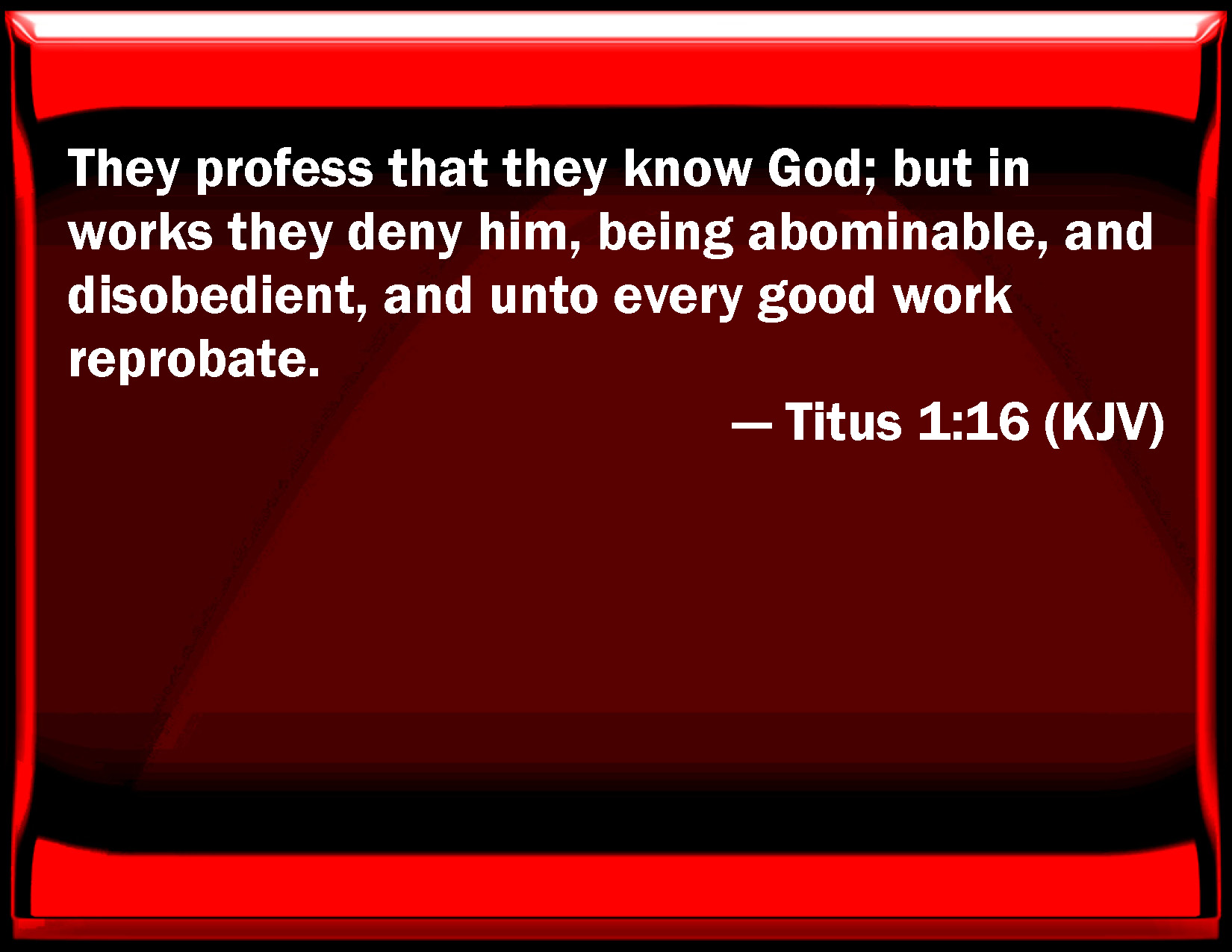 Bible Verse Slide Titus 1:16 They profess that they know God; but in works they deny him, being abominable, and disobedient, and to every good work reprobate. KJV: They profess that they know God; but in works they deny him, being abominable, and disobedient, and unto every good work reprobate. DRB: They profess that they know God: but in their works they deny him; being abominable, and incredulous, and to every good work reprobate. DBT: They profess to know God, but in works deny him, being abominable, and disobedient, and found worthless as to every good work. ERV: They profess that they know God; but by their works they deny him, being abominable, and disobedient, and unto every good work reprobate. WBT: They profess that they know God; but in works they deny him, being abominable, and disobedient, and to every good work reprobate. WEB: They profess that they know God, but by their works they deny him, being abominable, disobedient, and unfit for any good work. YLT: God they profess to know, and in the works they deny Him, being abominable, and disobedient, and unto every good work disapproved.Links Titus 1:16 NIV • Titus 1:16 NLT • Titus 1:16 ESV • Titus 1:16 NASB • Titus 1:16 KJV • Titus 1:16 Interlinear • Titus 1:16 Commentaries • Titus 1:16 Parallel Texts • Titus 1:16 Bible Apps • Titus 1:16 Parallel • Bible Hub |