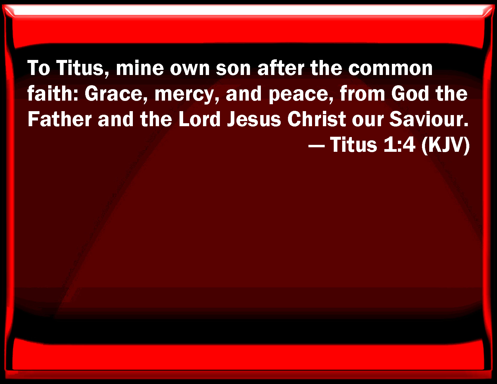 Bible Verse Slide Titus 1:4 To Titus, my own son after the common faith: Grace, mercy, and peace, from God the Father and the Lord Jesus Christ our Savior. KJV: To Titus, mine own son after the common faith: Grace, mercy, and peace, from God the Father and the Lord Jesus Christ our Saviour. DRB: To Titus my beloved son, according to the common faith, grace and peace from God the Father, and from Christ Jesus our Savior. DBT: to Titus, my own child according to the faith common to us: Grace and peace from God the Father, and Christ Jesus our Saviour. ERV: to Titus, my true child after a common faith: Grace and peace from God the Father and Christ Jesus our Saviour. WBT: To Titus, my own son after the common faith: Grace, mercy, and peace, from God the Father, and the Lord Jesus Christ our Savior. WEB: to Titus, my true child according to a common faith: Grace, mercy, and peace from God the Father and the Lord Jesus Christ our Savior. YLT: to Titus — true child according to a common faith: Grace, kindness, peace, from God the Father, and the Lord Jesus Christ our Saviour!Links Titus 1:4 NIV • Titus 1:4 NLT • Titus 1:4 ESV • Titus 1:4 NASB • Titus 1:4 KJV • Titus 1:4 Interlinear • Titus 1:4 Commentaries • Titus 1:4 Parallel Texts • Titus 1:4 Bible Apps • Titus 1:4 Parallel • Bible Hub |