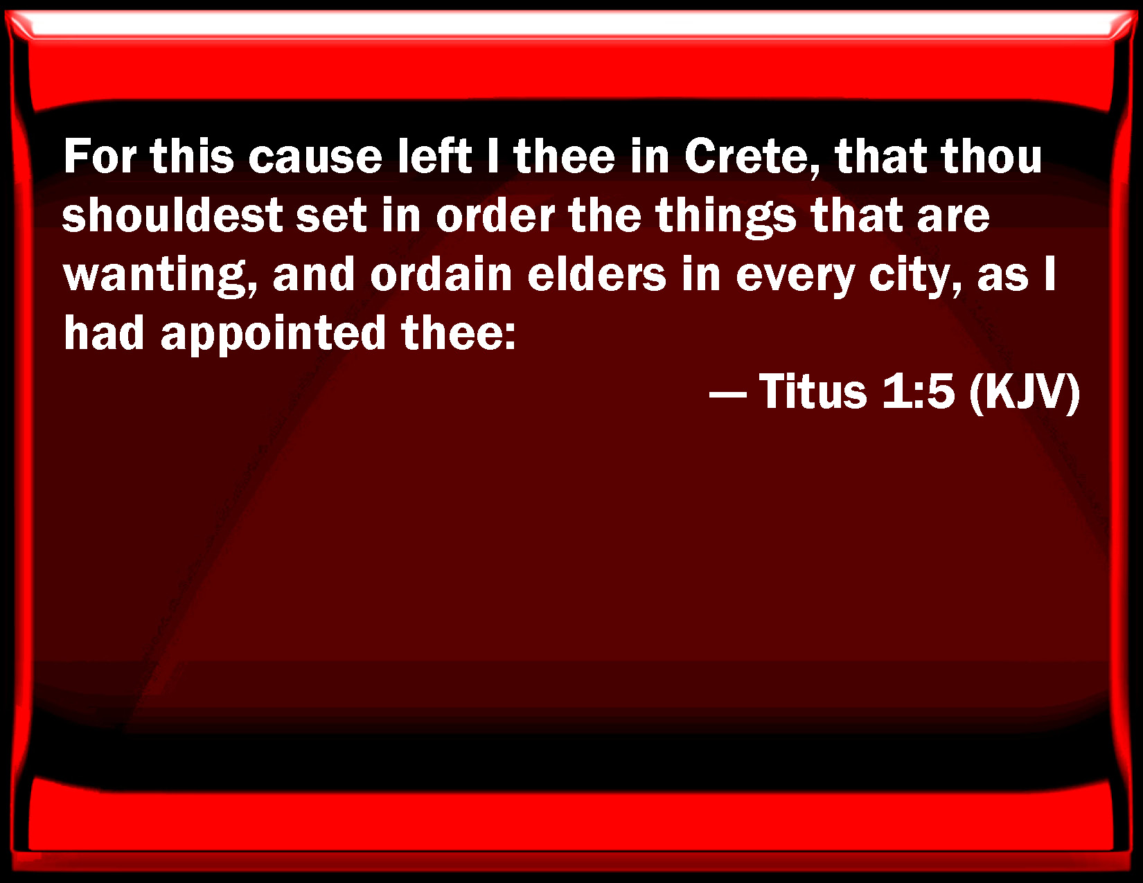 Bible Verse Slide Titus 1:5 For this cause left I you in Crete, that you should set in order the things that are wanting, and ordain elders in every city, as I had appointed you: KJV: For this cause left I thee in Crete, that thou shouldest set in order the things that are wanting, and ordain elders in every city, as I had appointed thee: DRB: For this cause I left thee in Crete, that thou shouldest set in order the things that are wanting, and shouldest ordain priests in every city, as I also appointed thee: DBT: For this cause I left thee in Crete, that thou mightest go on to set right what remained unordered, and establish elders in each city, as I had ordered thee: ERV: For this cause left I thee in Crete, that thou shouldest set in order the things that were wanting, and appoint elders in every city, as I gave thee charge; WBT: For this cause I left thee in Crete, that thou shouldst set in order the things that are wanting, and ordain elders in every city, as I had appointed thee: WEB: I left you in Crete for this reason, that you would set in order the things that were lacking, and appoint elders in every city, as I directed you; YLT: For this cause left I thee in Crete, that the things lacking thou mayest arrange, and mayest set down in every city elders, as I did appoint to thee;Links Titus 1:5 NIV • Titus 1:5 NLT • Titus 1:5 ESV • Titus 1:5 NASB • Titus 1:5 KJV • Titus 1:5 Interlinear • Titus 1:5 Commentaries • Titus 1:5 Parallel Texts • Titus 1:5 Bible Apps • Titus 1:5 Parallel • Bible Hub |