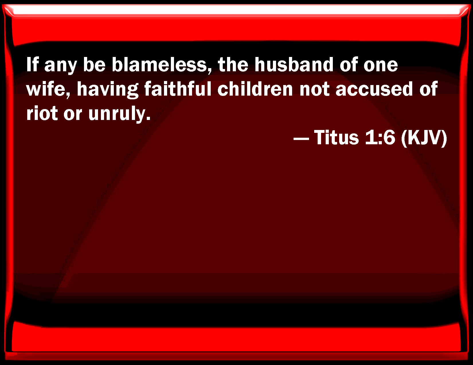 Bible Verse Slide Titus 1:6 If any be blameless, the husband of one wife, having faithful children not accused of riot or unruly. KJV: If any be blameless, the husband of one wife, having faithful children not accused of riot or unruly. DRB: If any be without crime, the husband of one wife, having faithful children, not accused of riot, or unruly. DBT: if any one be free from all charge against him, husband of one wife, having believing children not accused of excess or unruly. ERV: if any man is blameless, the husband of one wife, having children that believe, who are not accused of riot or unruly. WBT: If any is blameless, the husband of one wife, having faithful children, not accused of riot, or disorderly. WEB: if anyone is blameless, the husband of one wife, having children who believe, who are not accused of loose or unruly behavior. YLT: if any one is blameless, of one wife a husband, having children stedfast, not under accusation of riotous living or insubordinate — Links Titus 1:6 NIV • Titus 1:6 NLT • Titus 1:6 ESV • Titus 1:6 NASB • Titus 1:6 KJV • Titus 1:6 Interlinear • Titus 1:6 Commentaries • Titus 1:6 Parallel Texts • Titus 1:6 Bible Apps • Titus 1:6 Parallel • Bible Hub |