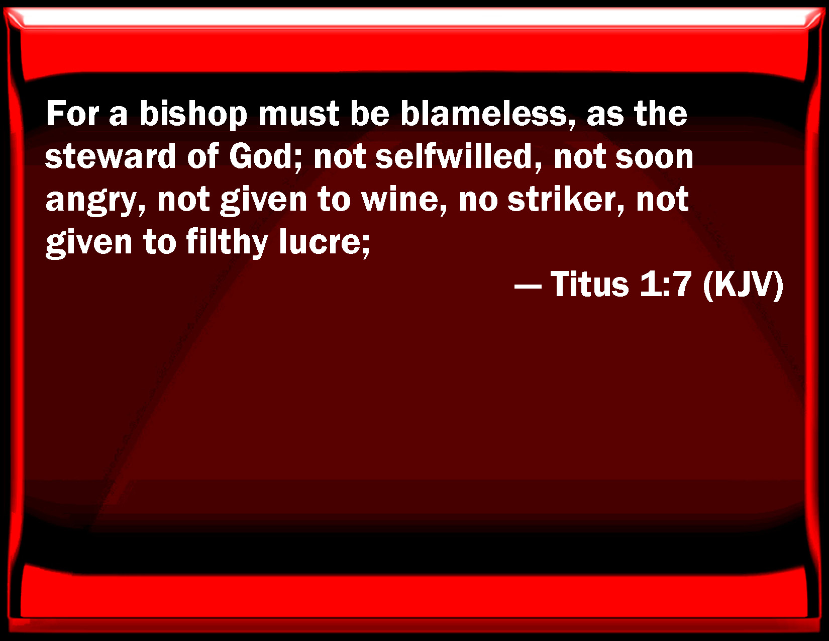 Bible Verse Slide Titus 1:7 For a bishop must be blameless, as the steward of God; not self-willed, not soon angry, not given to wine, no striker, not given to filthy lucre; KJV: For a bishop must be blameless, as the steward of God; not selfwilled, not soon angry, not given to wine, no striker, not given to filthy lucre; DRB: For a bishop must be without crime, as the steward of God: not proud, not subject to anger, not given to wine, no striker, not greedy of filthy lucre: DBT: For the overseer must be free from all charge against him as God's steward; not headstrong, not passionate, not disorderly through wine, not a striker, not seeking gain by base means; ERV: For the bishop must be blameless, as God's steward; not selfwilled, not soon angry, no brawler, no striker, not greedy of filthy lucre; WBT: For a bishop must be blameless, as the steward of God; not self-willed, not soon angry, not given to wine, no striker, not given to filthy lucre; WEB: For the overseer must be blameless, as God's steward; not self-pleasing, not easily angered, not given to wine, not violent, not greedy for dishonest gain; YLT: for it behoveth the overseer to be blameless, as God's steward, not self-pleased, nor irascible, not given to wine, not a striker, not given to filthy lucre;Links Titus 1:7 NIV • Titus 1:7 NLT • Titus 1:7 ESV • Titus 1:7 NASB • Titus 1:7 KJV • Titus 1:7 Interlinear • Titus 1:7 Commentaries • Titus 1:7 Parallel Texts • Titus 1:7 Bible Apps • Titus 1:7 Parallel • Bible Hub |