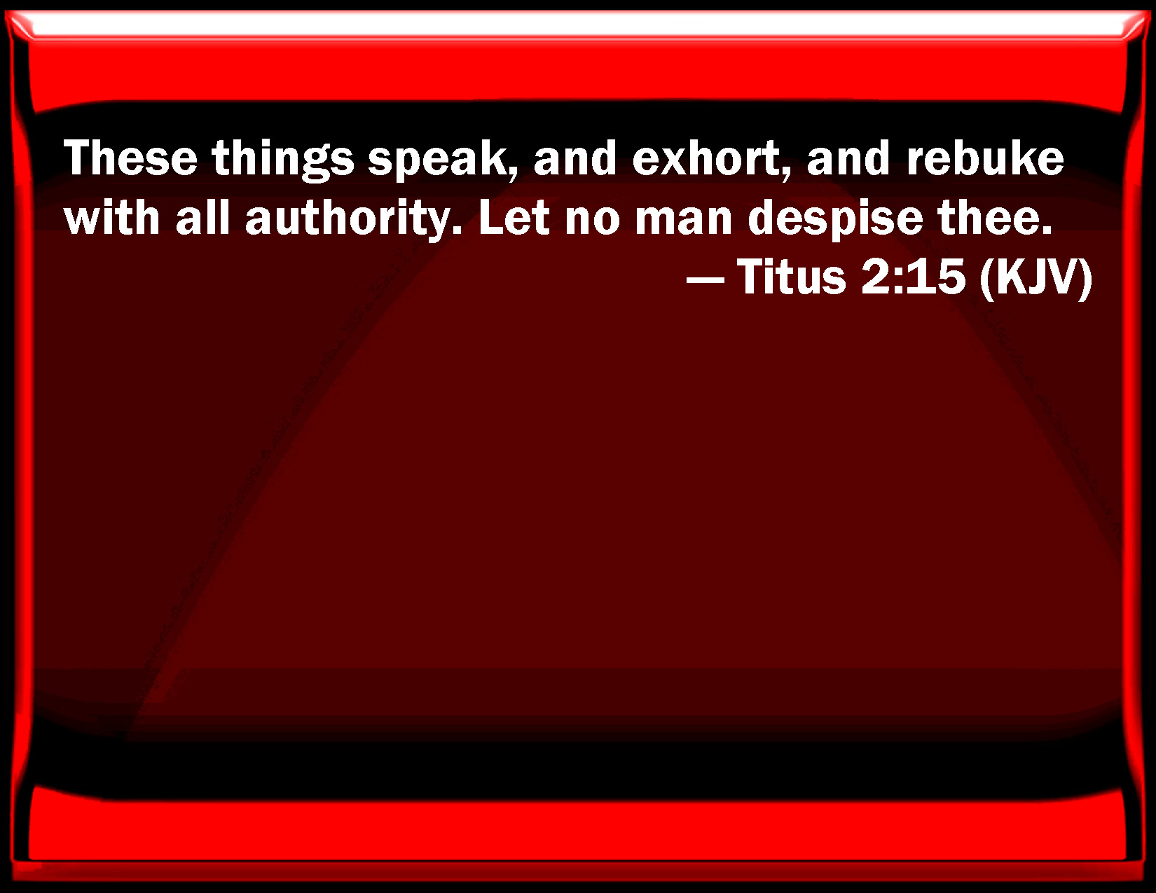 Bible Verse Slide Titus 2:15 These things speak, and exhort, and rebuke with all authority. Let no man despise you. KJV: These things speak, and exhort, and rebuke with all authority. Let no man despise thee. DRB: These things speak, and exhort and rebuke with all authority. Let no man despise thee. DBT: These things speak, and exhort, and rebuke with all authority. Let no one despise thee. ERV: These things speak and exhort and reprove with all authority. Let no man despise thee. WBT: These things speak, and exhort, and rebuke with all authority. Let no man despise thee. WEB: Say these things and exhort and reprove with all authority. Let no man despise you. YLT: these things be speaking, and exhorting, and convicting, with all charge; let no one despise thee!Links Titus 2:15 NIV • Titus 2:15 NLT • Titus 2:15 ESV • Titus 2:15 NASB • Titus 2:15 KJV • Titus 2:15 Interlinear • Titus 2:15 Commentaries • Titus 2:15 Parallel Texts • Titus 2:15 Bible Apps • Titus 2:15 Parallel • Bible Hub |