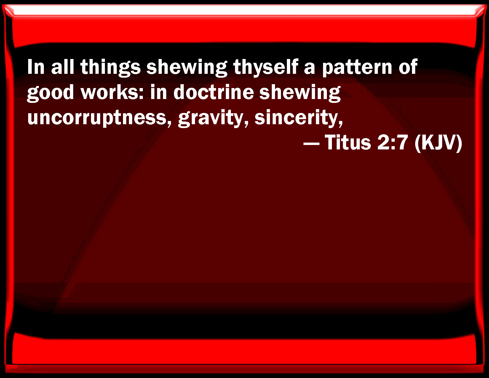 Bible Verse Slide Titus 2:7 In all things showing yourself a pattern of good works: in doctrine showing soundness, gravity, sincerity, KJV: In all things shewing thyself a pattern of good works: in doctrine shewing uncorruptness, gravity, sincerity, DRB: In all things shew thyself an example of good works, in doctrine, in integrity, in gravity, DBT: in all things affording thyself as a pattern of good works; in teaching uncorruptedness, gravity, ERV: in all things shewing thyself an ensample of good works; in thy doctrine shewing uncorruptness, gravity, WBT: In all things showing thyself a pattern of good works: in doctrine showing incorruptness, gravity, sincerity, WEB: in all things showing yourself an example of good works; in your teaching showing integrity, seriousness, incorruptibility, YLT: concerning all things thyself showing a pattern of good works; in the teaching uncorruptedness, gravity, incorruptibility,Links Titus 2:7 NIV • Titus 2:7 NLT • Titus 2:7 ESV • Titus 2:7 NASB • Titus 2:7 KJV • Titus 2:7 Interlinear • Titus 2:7 Commentaries • Titus 2:7 Parallel Texts • Titus 2:7 Bible Apps • Titus 2:7 Parallel • Bible Hub |