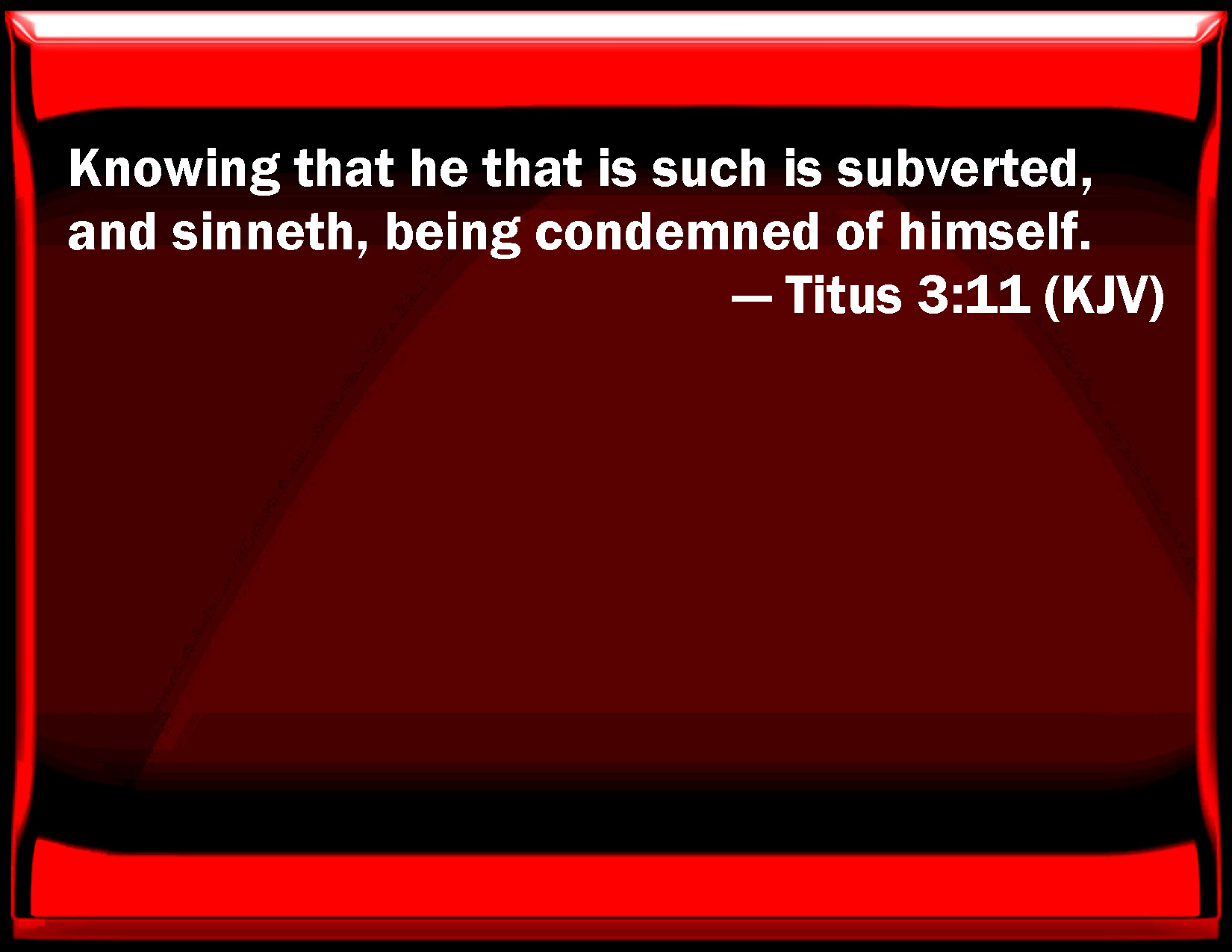 Bible Verse Slide Titus 3:11 Knowing that he that is such is subverted, and sins, being condemned of himself. KJV: Knowing that he that is such is subverted, and sinneth, being condemned of himself. DRB: Knowing that he, that is such an one, is subverted, and sinneth, being condemned by his own judgment. DBT: knowing that such a one is perverted, and sins, being self-condemned. ERV: knowing that such a one is perverted, and sinneth, being self-condemned. WBT: Knowing that he who is such, is subverted, and sinneth, being condemned by himself. WEB: knowing that such a one is perverted, and sins, being self-condemned. YLT: having known that he hath been subverted who is such, and doth sin, being self-condemned.Links Titus 3:11 NIV • Titus 3:11 NLT • Titus 3:11 ESV • Titus 3:11 NASB • Titus 3:11 KJV • Titus 3:11 Interlinear • Titus 3:11 Commentaries • Titus 3:11 Parallel Texts • Titus 3:11 Bible Apps • Titus 3:11 Parallel • Bible Hub |