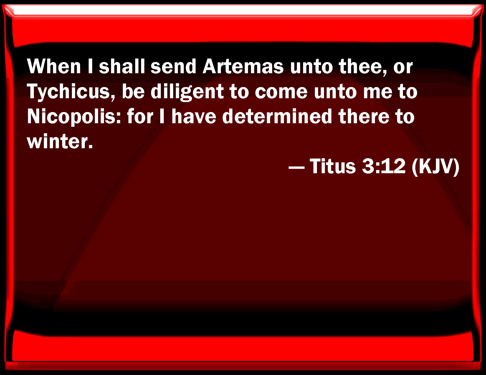 Bible Verse Slide Titus 3:12 When I shall send Artemas to you, or Tychicus, be diligent to come to me to Nicopolis: for I have determined there to winter. KJV: When I shall send Artemas unto thee, or Tychicus, be diligent to come unto me to Nicopolis: for I have determined there to winter. DRB: When I shall send to thee Artemas or Tychicus, make haste to come unto me to Nicopolis. For there I have determined to winter. DBT: When I shall send Artemas to thee, or Tychicus, use diligence to come to me to Nicopolis; for I have decided to winter there. ERV: When I shall send Artemas unto thee, or Tychicus, give diligence to come unto me to Nicopolis: for there I have determined to winter. WBT: When I shall send Artemas to thee, or Tychicus, be diligent to come to me to Nicopolis: for I have determined there to winter. WEB: When I send Artemas to you, or Tychicus, be diligent to come to me to Nicopolis, for I have determined to winter there. YLT: When I shall send Artemas unto thee, or Tychicus, be diligent to come unto me to Nicopolis, for there to winter I have determined.Links Titus 3:12 NIV • Titus 3:12 NLT • Titus 3:12 ESV • Titus 3:12 NASB • Titus 3:12 KJV • Titus 3:12 Interlinear • Titus 3:12 Commentaries • Titus 3:12 Parallel Texts • Titus 3:12 Bible Apps • Titus 3:12 Parallel • Bible Hub |