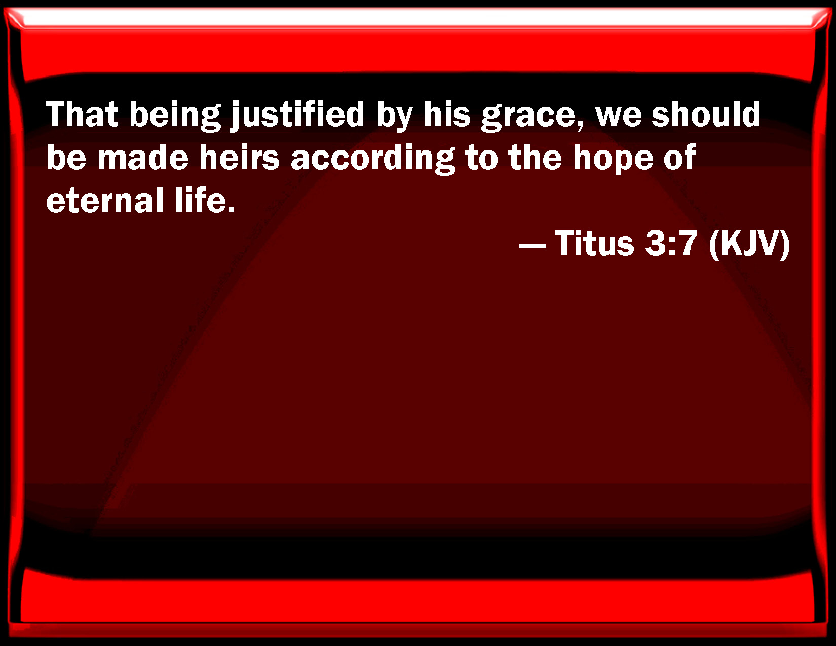 Bible Verse Slide Titus 3:7 That being justified by his grace, we should be made heirs according to the hope of eternal life. KJV: That being justified by his grace, we should be made heirs according to the hope of eternal life. DRB: That, being justified by his grace, we may be heirs, according to hope of life everlasting. DBT: that, having been justified by his grace, we should become heirs according to the hope of eternal life. ERV: that, being justified by his grace, we might be made heirs according to the hope of eternal life. WBT: That being justified by his grace, we should be made heirs according to the hope of eternal life. WEB: that, being justified by his grace, we might be made heirs according to the hope of eternal life. YLT: that having been declared righteous by His grace, heirs we may become according to the hope of life age-during.Links Titus 3:7 NIV • Titus 3:7 NLT • Titus 3:7 ESV • Titus 3:7 NASB • Titus 3:7 KJV • Titus 3:7 Interlinear • Titus 3:7 Commentaries • Titus 3:7 Parallel Texts • Titus 3:7 Bible Apps • Titus 3:7 Parallel • Bible Hub |