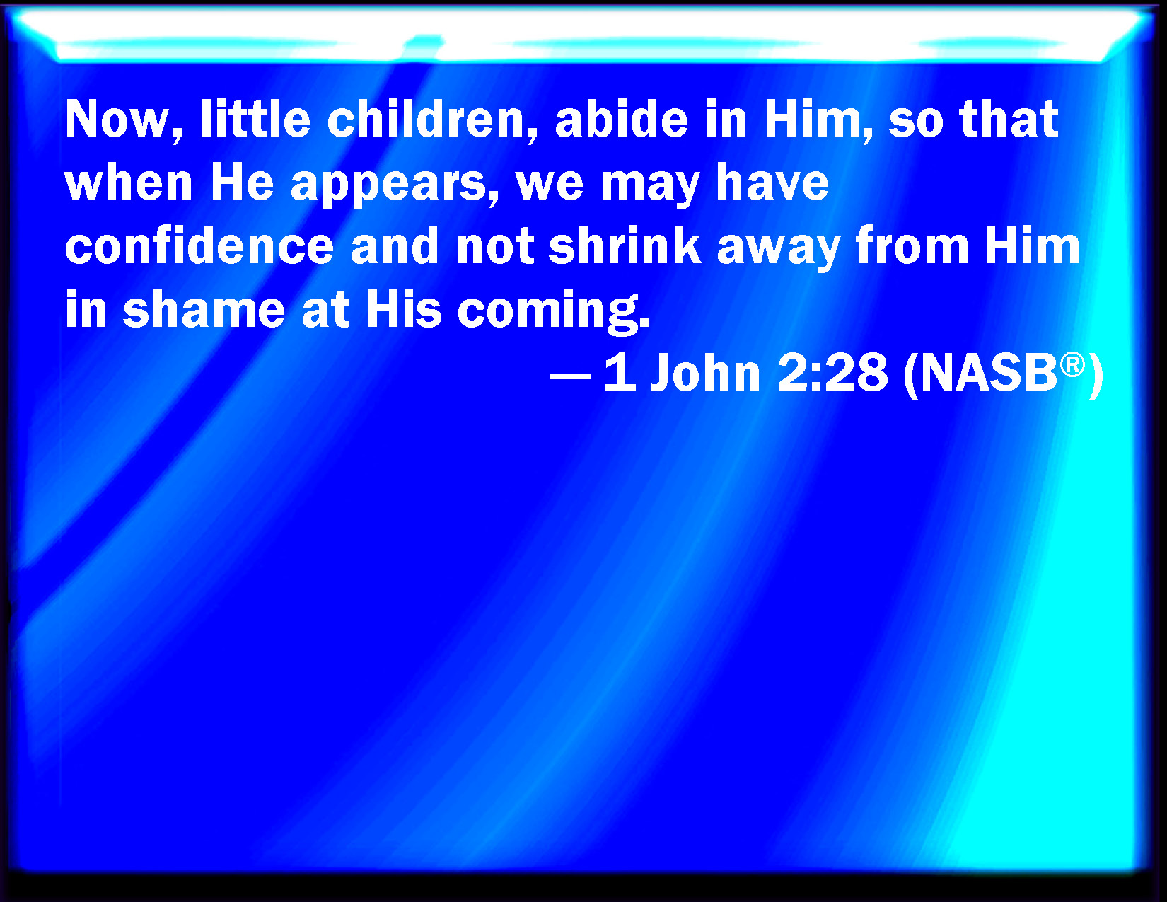 Bible Verse Slide 1 John 2:28 And now, little children, abide in him; that, when he shall appear, we may have confidence, and not be ashamed before him at his coming. KJV: And now, little children, abide in him; that, when he shall appear, we may have confidence, and not be ashamed before him at his coming. DRB: And now, little children, abide in him, that when he shall appear, we may have confidence, and not be confounded by him at his coming. DBT: And now, children, abide in him, that if he be manifested we may have boldness, and not be put to shame from before him at his coming. ERV: And now, my little children, abide in him; that, if he shall be manifested, we may have boldness, and not be ashamed before him at his coming. WBT: And now, little children, abide in him; that when he shall appear, we may have confidence, and not be ashamed before him at his coming. WEB: Now, little children, remain in him, that when he appears, we may have boldness, and not be ashamed before him at his coming. YLT: And now, little children, remain in him, that when he may be manifested, we may have boldness, and may not be ashamed before him, in his presence;Links 1 John 2:28 NIV • 1 John 2:28 NLT • 1 John 2:28 ESV • 1 John 2:28 NASB • 1 John 2:28 KJV • 1 John 2:28 Interlinear • 1 John 2:28 Commentaries • 1 John 2:28 Parallel Texts • 1 John 2:28 Bible Apps • 1 John 2:28 Parallel • Bible Hub |
