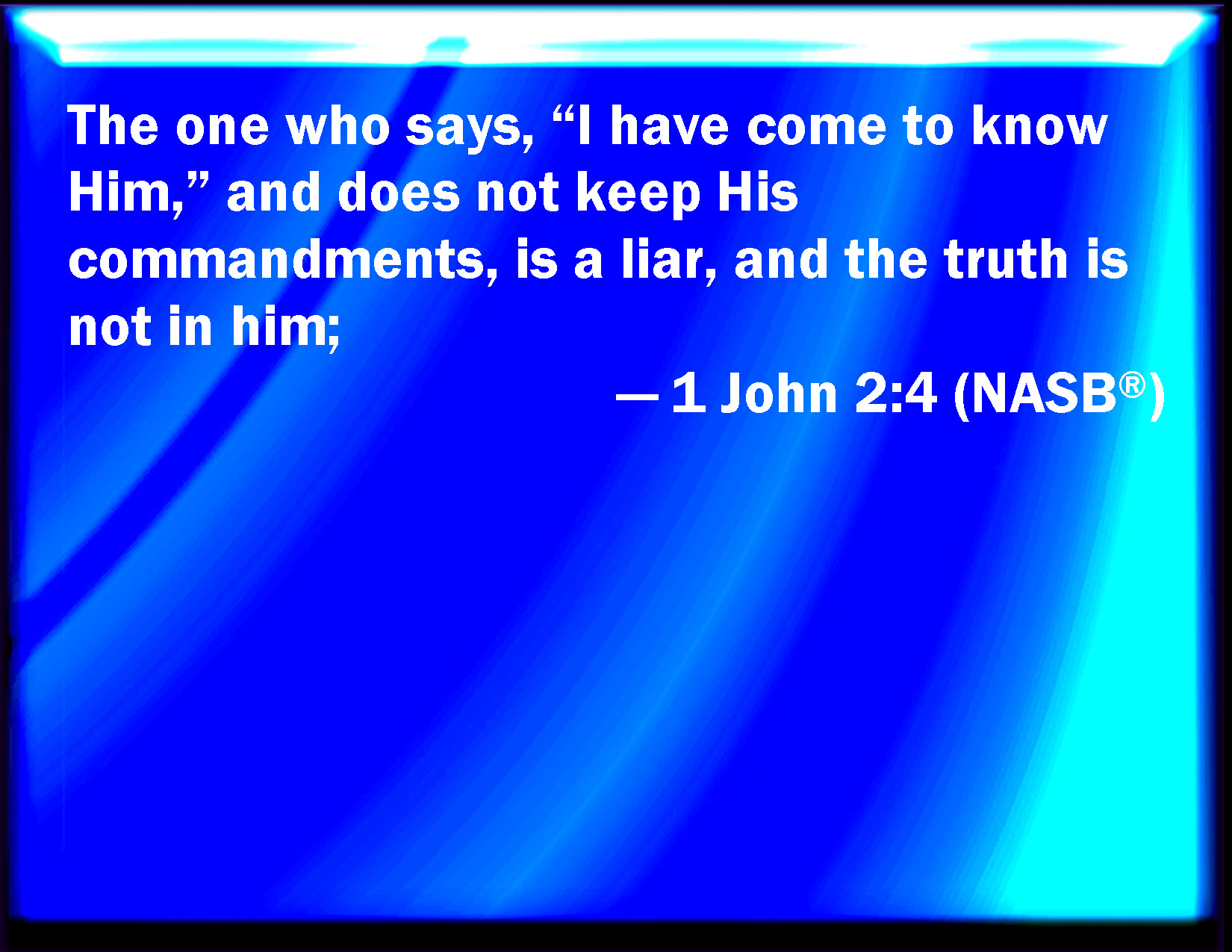 Bible Verse Slide 1 John 2:4 He that said, I know him, and keeps not his commandments, is a liar, and the truth is not in him. KJV: He that saith, I know him, and keepeth not his commandments, is a liar, and the truth is not in him. DRB: He who saith that he knoweth him, and keepeth not his commandments, is a liar, and the truth is not in him. DBT: He that says, I know him, and does not keep his commandments, is a liar, and the truth is not in him; ERV: He that saith, I know him, and keepeth not his commandments, is a liar, and the truth is not in him: WBT: He that saith, I know him, and keepeth not his commandments, is a liar, and the truth is not in him. WEB: One who says, "I know him," and doesn't keep his commandments, is a liar, and the truth isn't in him. YLT: he who is saying, 'I have known him,' and his command is not keeping, a liar he is, and in him the truth is not;Links 1 John 2:4 NIV • 1 John 2:4 NLT • 1 John 2:4 ESV • 1 John 2:4 NASB • 1 John 2:4 KJV • 1 John 2:4 Interlinear • 1 John 2:4 Commentaries • 1 John 2:4 Parallel Texts • 1 John 2:4 Bible Apps • 1 John 2:4 Parallel • Bible Hub |