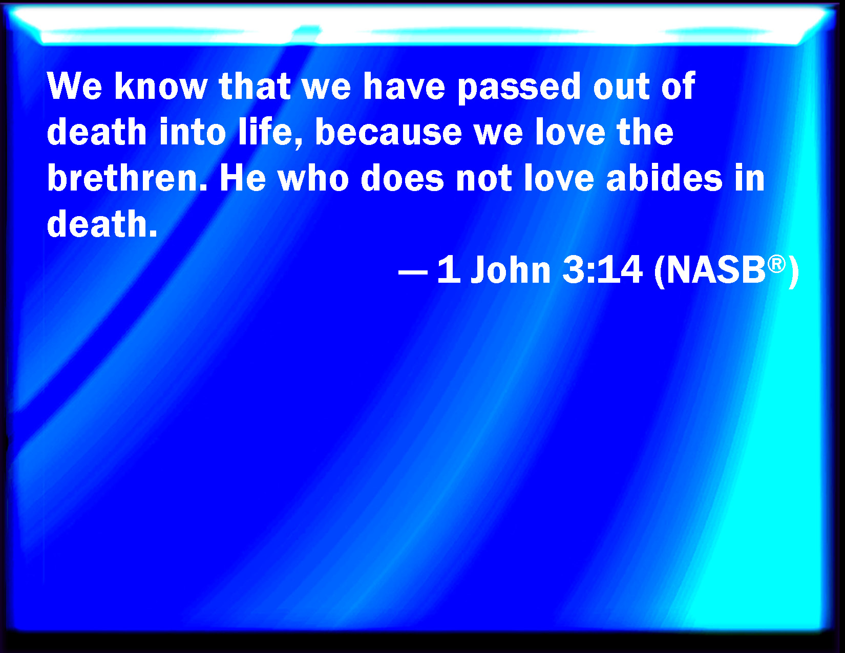 Bible Verse Slide 1 John 3:14 We know that we have passed from death to life, because we love the brothers. He that loves not his brother stays in death. KJV: We know that we have passed from death unto life, because we love the brethren. He that loveth not his brother abideth in death. DRB: We know that we have passed from death to life, because we love the brethren. He that loveth not, abideth in death. DBT: We know that we have passed from death to life, because we love the brethren. He who does not love his brother abides in death. ERV: We know that we have passed out of death into life, because we love the brethren. He that loveth not abideth in death. WBT: We know that we have passed from death to life, because we love the brethren. He that loveth not his brother, abideth in death. WEB: We know that we have passed out of death into life, because we love the brothers. He who doesn't love his brother remains in death. YLT: we — we have known that we have passed out of the death to the life, because we love the brethren; he who is not loving the brother doth remain in the death.Links 1 John 3:14 NIV • 1 John 3:14 NLT • 1 John 3:14 ESV • 1 John 3:14 NASB • 1 John 3:14 KJV • 1 John 3:14 Interlinear • 1 John 3:14 Commentaries • 1 John 3:14 Parallel Texts • 1 John 3:14 Bible Apps • 1 John 3:14 Parallel • Bible Hub |