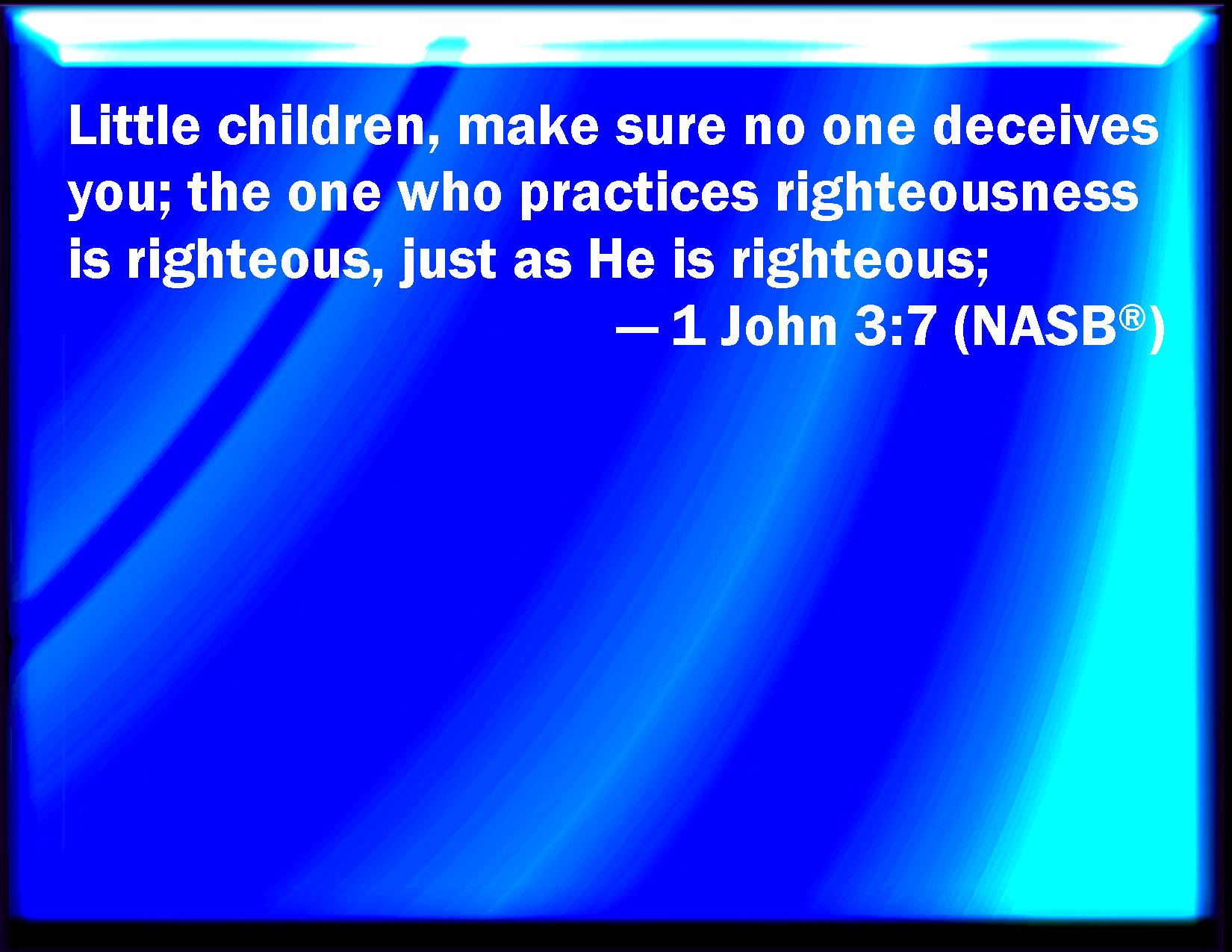 Bible Verse Slide 1 John 3:7 Little children, let no man deceive you: he that does righteousness is righteous, even as he is righteous. KJV: Little children, let no man deceive you: he that doeth righteousness is righteous, even as he is righteous. DRB: Little children, let no man deceive you. He that doth justice is just, even as he is just. DBT: Children, let no man lead you astray; he that practises righteousness is righteous, even as he is righteous. ERV: My little children, let no man lead you astray: he that doeth righteousness is righteous, even as he is righteous: WBT: Little children, let no man deceive you: he that doeth righteousness is righteous, even as he is righteous. WEB: Little children, let no one lead you astray. He who does righteousness is righteous, even as he is righteous. YLT: Little children, let no one lead you astray; he who is doing the righteousness is righteous, even as he is righteous,Links 1 John 3:7 NIV • 1 John 3:7 NLT • 1 John 3:7 ESV • 1 John 3:7 NASB • 1 John 3:7 KJV • 1 John 3:7 Interlinear • 1 John 3:7 Commentaries • 1 John 3:7 Parallel Texts • 1 John 3:7 Bible Apps • 1 John 3:7 Parallel • Bible Hub |