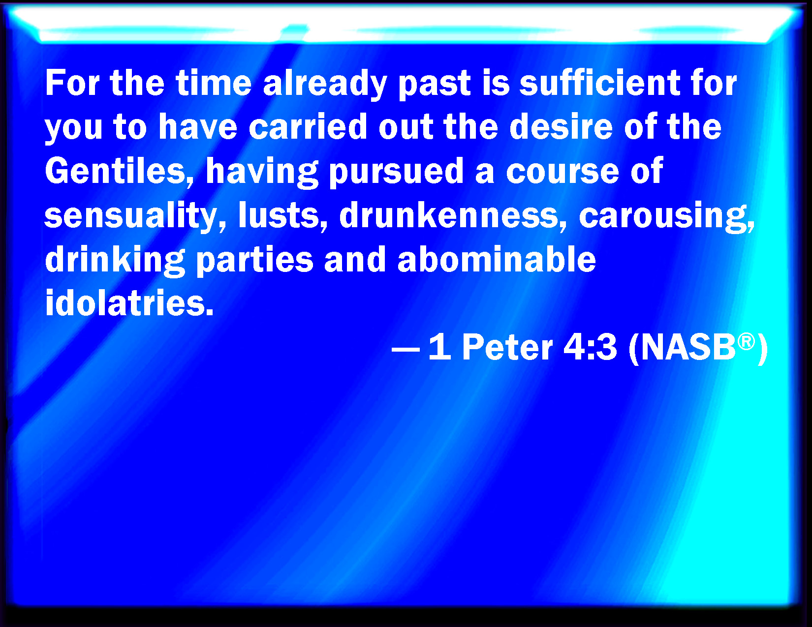 Bible Verse Slide 1 Peter 4:3 For the time past of our life may suffice us to have worked the will of the Gentiles, when we walked in lasciviousness, lusts, excess of wine, revelings, parties, and abominable idolatries: KJV: For the time past of our life may suffice us to have wrought the will of the Gentiles, when we walked in lasciviousness, lusts, excess of wine, revellings, banquetings, and abominable idolatries: DRB: For the time past is sufficient to have fulfilled the will of the Gentiles, for them who have walked in riotousness, lusts, excess of wine, revellings, banquetings, and unlawful worshipping of idols. DBT: For the time past is sufficient for us to have wrought the will of the Gentiles, walking in lasciviousness, lusts, wine-drinking, revels, drinkings, and unhallowed idolatries. ERV: For the time past may suffice to have wrought the desire of the Gentiles, and to have walked in lasciviousness, lusts, winebibbings, revellings, carousings, and abominable idolatries: WBT: For the time past of our life may suffice us to have wrought the will of the Gentiles, when we walked in lasciviousness, lusts, excess of wine, revelings, banquetings, and abominable idolatries: WEB: For we have spent enough of our past time doing the desire of the Gentiles, and having walked in lewdness, lusts, drunken binges, orgies, carousings, and abominable idolatries. YLT: for sufficient to us is the past time of life the will of the nations to have wrought, having walked in lasciviousnesses, desires, excesses of wines, revellings, drinking-bouts, and unlawful idolatries,Links 1 Peter 4:3 NIV • 1 Peter 4:3 NLT • 1 Peter 4:3 ESV • 1 Peter 4:3 NASB • 1 Peter 4:3 KJV • 1 Peter 4:3 Interlinear • 1 Peter 4:3 Commentaries • 1 Peter 4:3 Parallel Texts • 1 Peter 4:3 Bible Apps • 1 Peter 4:3 Parallel • Bible Hub |