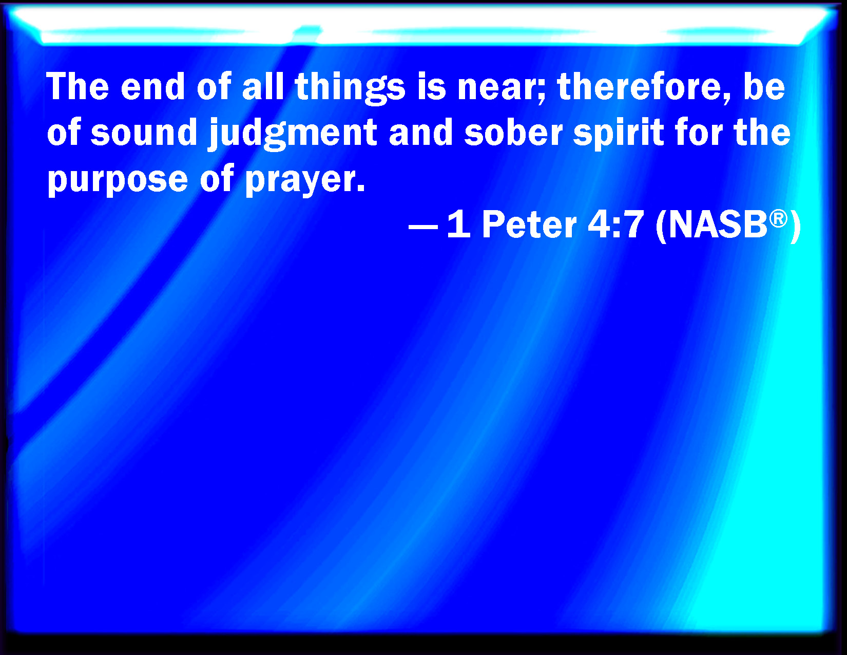 Bible Verse Slide 1 Peter 4:7 But the end of all things is at hand: be you therefore sober, and watch to prayer. KJV: But the end of all things is at hand: be ye therefore sober, and watch unto prayer. DRB: But the end of all is at hand. Be prudent therefore, and watch in prayers. DBT: But the end of all things is drawn nigh: be sober therefore, and be watchful unto prayers; ERV: But the end of all things is at hand: be ye therefore of sound mind, and be sober unto prayer: WBT: But the end of all things is at hand: be ye therefore sober, and watch to prayer. WEB: But the end of all things is near. Therefore be of sound mind, self-controlled, and sober in prayer. YLT: And of all things the end hath come nigh; be sober-minded, then, and watch unto the prayers,Links 1 Peter 4:7 NIV • 1 Peter 4:7 NLT • 1 Peter 4:7 ESV • 1 Peter 4:7 NASB • 1 Peter 4:7 KJV • 1 Peter 4:7 Interlinear • 1 Peter 4:7 Commentaries • 1 Peter 4:7 Parallel Texts • 1 Peter 4:7 Bible Apps • 1 Peter 4:7 Parallel • Bible Hub |