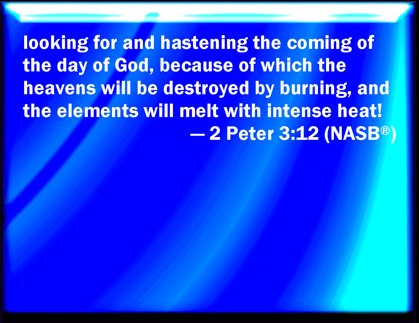 Bible Verse Slide 2 Peter 3:12 Looking for and hastening to the coming of the day of God, wherein the heavens being on fire shall be dissolved, and the elements shall melt with fervent heat? KJV: Looking for and hasting unto the coming of the day of God, wherein the heavens being on fire shall be dissolved, and the elements shall melt with fervent heat? DRB: Looking for and hasting unto the coming of the day of the Lord, by which the heavens being on fire shall be dissolved, and the elements shall melt with the burning heat? DBT: waiting for and hastening the coming of the day of God, by reason of which the heavens, being on fire, shall be dissolved, and the elements, burning with heat, shall melt? ERV: looking for and earnestly desiring the coming of the day of God, by reason of which the heavens being on fire shall be dissolved, and the elements shall melt with fervent heat? WBT: Looking for and hasting to the coming of the day of God, in which the heavens being on fire will be dissolved, and the elements will melt with fervent heat? WEB: looking for and earnestly desiring the coming of the day of God, which will cause the burning heavens to be dissolved, and the elements will melt with fervent heat? YLT: waiting for and hasting to the presence of the day of God, by which the heavens, being on fire, shall be dissolved, and the elements with burning heat shall melt;Links 2 Peter 3:12 NIV • 2 Peter 3:12 NLT • 2 Peter 3:12 ESV • 2 Peter 3:12 NASB • 2 Peter 3:12 KJV • 2 Peter 3:12 Interlinear • 2 Peter 3:12 Commentaries • 2 Peter 3:12 Parallel Texts • 2 Peter 3:12 Bible Apps • 2 Peter 3:12 Parallel • Bible Hub |