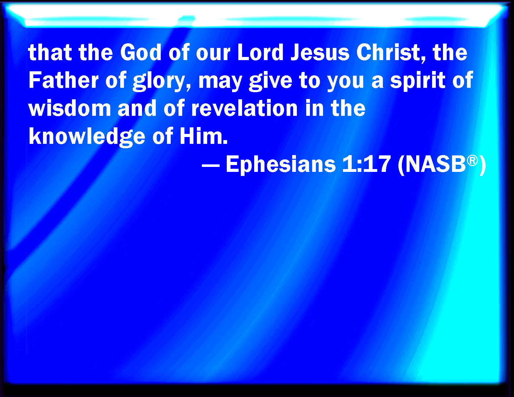 Bible Verse Slide Ephesians 1:17 That the God of our Lord Jesus Christ, the Father of glory, may give to you the spirit of wisdom and revelation in the knowledge of him: KJV: That the God of our Lord Jesus Christ, the Father of glory, may give unto you the spirit of wisdom and revelation in the knowledge of him: DRB: That the God of our Lord Jesus Christ, the Father of glory, may give unto you the spirit of wisdom and of revelation, in the knowledge of him: DBT: that the God of our Lord Jesus Christ, the Father of glory, would give you the spirit of wisdom and revelation in the full knowledge of him, ERV: that the God of our Lord Jesus Christ, the Father of glory, may give unto you a spirit of wisdom and revelation in the knowledge of him; WBT: That the God of our Lord Jesus Christ, the Father of glory, may give to you the spirit of wisdom and revelation in the knowledge of him: WEB: that the God of our Lord Jesus Christ, the Father of glory, may give to you a spirit of wisdom and revelation in the knowledge of him; YLT: that the God of our Lord Jesus Christ, the Father of the glory, may give to you a spirit of wisdom and revelation in the recognition of him,Links Ephesians 1:17 NIV • Ephesians 1:17 NLT • Ephesians 1:17 ESV • Ephesians 1:17 NASB • Ephesians 1:17 KJV • Ephesians 1:17 Interlinear • Ephesians 1:17 Commentaries • Ephesians 1:17 Parallel Texts • Ephesians 1:17 Bible Apps • Ephesians 1:17 Parallel • Bible Hub |