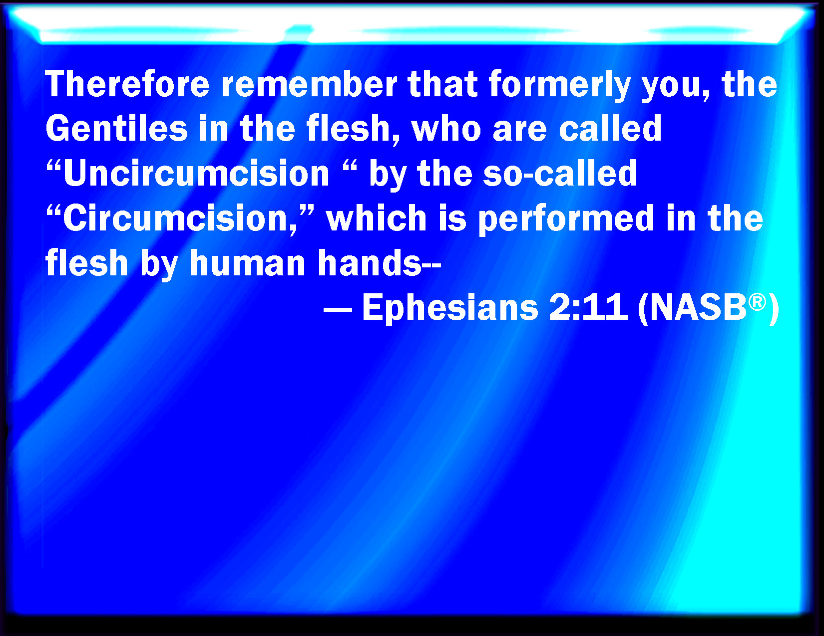Bible Verse Slide Ephesians 2:11 Why remember, that you being in time past Gentiles in the flesh, who are called Uncircumcision by that which is called the Circumcision in the flesh made by hands; KJV: Wherefore remember, that ye being in time past Gentiles in the flesh, who are called Uncircumcision by that which is called the Circumcision in the flesh made by hands; DRB: For which cause be mindful that you, being heretofore Gentiles in the flesh, who are called uncircumcision by that which is called circumcision in the flesh, made by hands; DBT: Wherefore remember that ye, once nations in the flesh, who are called uncircumcision by that called circumcision in the flesh done with the hand; ERV: Wherefore remember, that aforetime ye, the Gentiles in the flesh, who are called Uncircumcision by that which is called Circumcision, in the flesh, made by hands; WBT: Wherefore remember, that ye being in time past Gentiles in the flesh, who are called Uncircumcision by that which is called the Circumcision in the flesh made by hands; WEB: Therefore remember that once you, the Gentiles in the flesh, who are called "uncircumcision" by that which is called "circumcision," (in the flesh, made by hands); YLT: Wherefore, remember, that ye were once the nations in the flesh, who are called Uncircumcision by that called Circumcision in the flesh made by hands,Links Ephesians 2:11 NIV • Ephesians 2:11 NLT • Ephesians 2:11 ESV • Ephesians 2:11 NASB • Ephesians 2:11 KJV • Ephesians 2:11 Interlinear • Ephesians 2:11 Commentaries • Ephesians 2:11 Parallel Texts • Ephesians 2:11 Bible Apps • Ephesians 2:11 Parallel • Bible Hub |