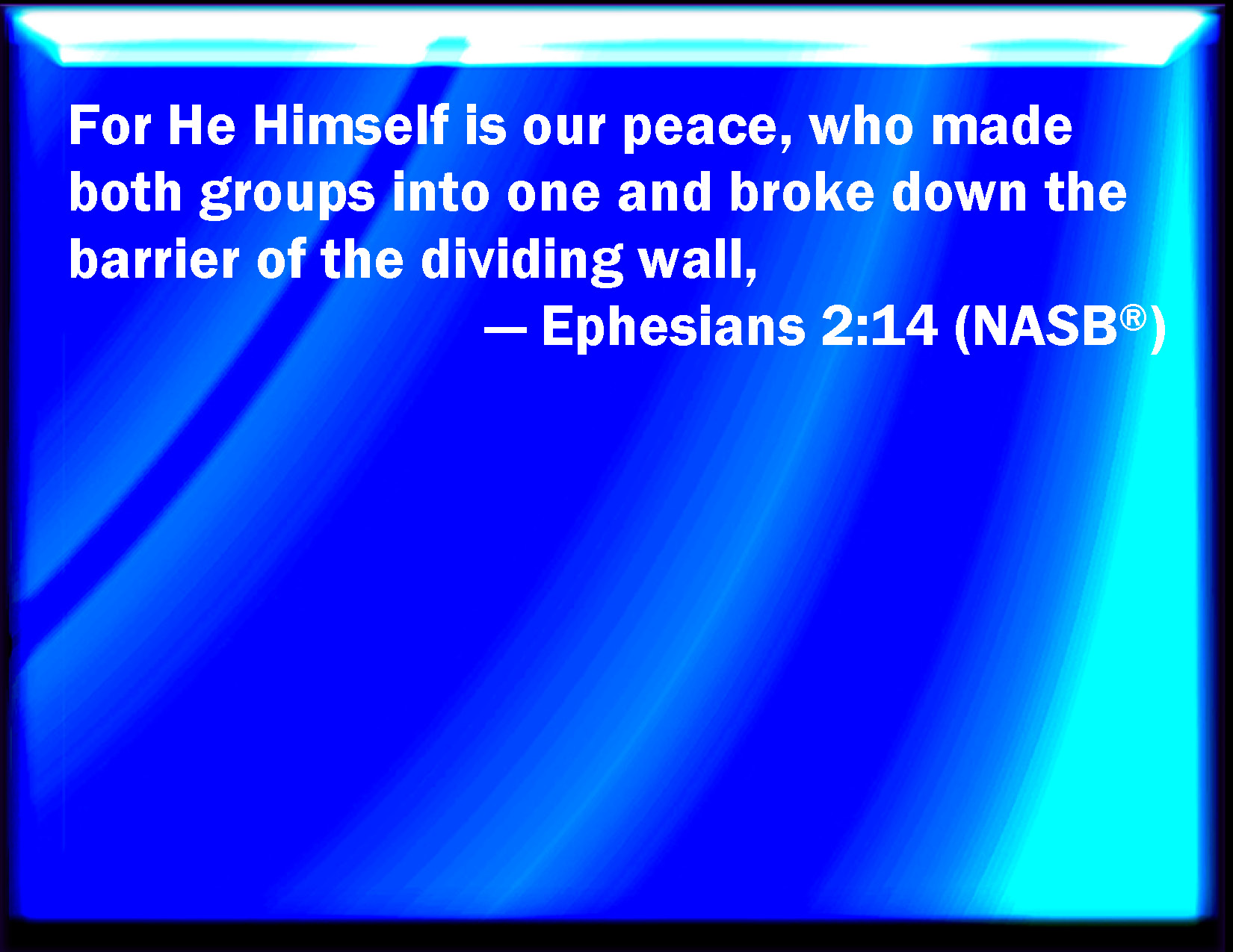 Bible Verse Slide Ephesians 2:14 For he is our peace, who has made both one, and has broken down the middle wall of partition between us; KJV: For he is our peace, who hath made both one, and hath broken down the middle wall of partition between us; DRB: For he is our peace, who hath made both one, and breaking down the middle wall of partition, the enmities in his flesh: DBT: For he is our peace, who has made both one, and has broken down the middle wall of enclosure, ERV: For he is our peace, who made both one, and brake down the middle wall of partition, WBT: For he is our peace, who hath made both one, and hath broken down the middle wall of partition between us; WEB: For he is our peace, who made both one, and broke down the middle wall of partition, YLT: for he is our peace, who did make both one, and the middle wall of the enclosure did break down,Links Ephesians 2:14 NIV • Ephesians 2:14 NLT • Ephesians 2:14 ESV • Ephesians 2:14 NASB • Ephesians 2:14 KJV • Ephesians 2:14 Interlinear • Ephesians 2:14 Commentaries • Ephesians 2:14 Parallel Texts • Ephesians 2:14 Bible Apps • Ephesians 2:14 Parallel • Bible Hub |